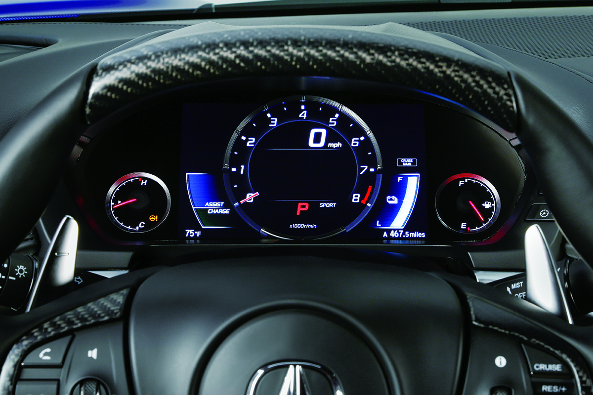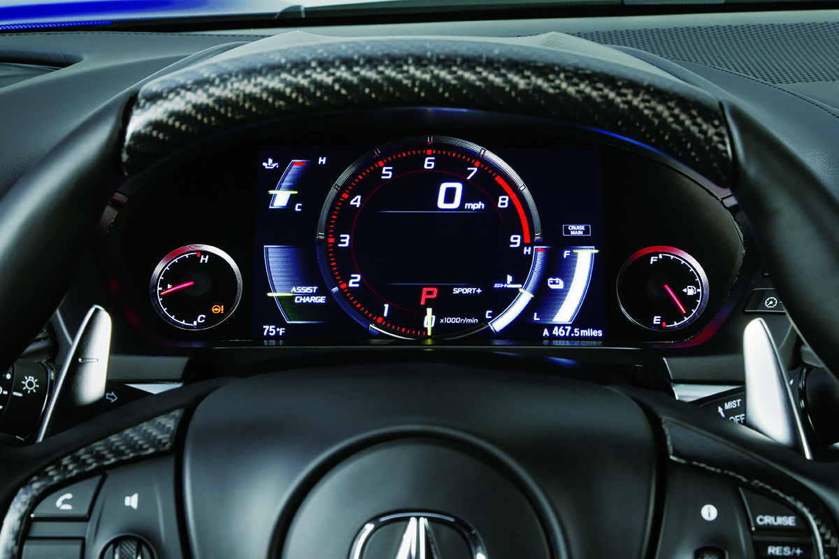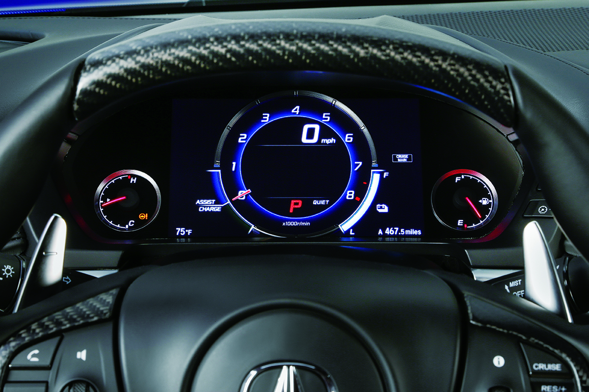 | NSX採用數位式儀錶,中央轉速錶可隨IDS不同模式改變顏色來提醒駕駛者。三幅多功能方向盤後方則配有換檔撥片(右升左降)。 |