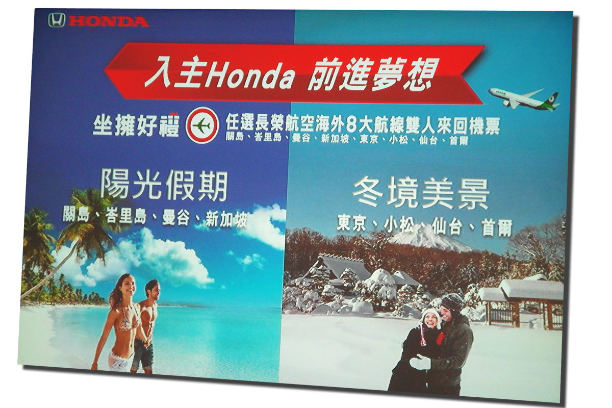 今年冬天,Honda Taiwan為了感謝顧客的支持與肯定,即日起獻上夢想好禮,全國據點同步展開「入主Honda前進夢想」活動,本月入主Honda並完成領牌即享「關島陽光假期」或「日本冬境美景」等任選長榮航空八大航線雙人來回機票 (註1)。凡活動期間內來店試乘即可參加「夢想獻禮自由選」抽獎活動,獎項包含價值達28.8萬元之「羽量級移動逸品Honda大型重型機車NSS300」、價值達7萬元之「日本東京五天四夜茂木賽道主題樂園雙人套裝旅遊」、「嚴選國內頂級飯店渡假響宴雙人行」以及「湯屋紓壓、美饡下午茶雙人套裝行程」等多項精選雙人夢想獻禮,總價值超過400萬元。此外,為能響應政府舊車換新補助政策,同步加碼推出指定車款本月入主再享高額0利率的優惠活動,最佳購車機會,敬請把握。