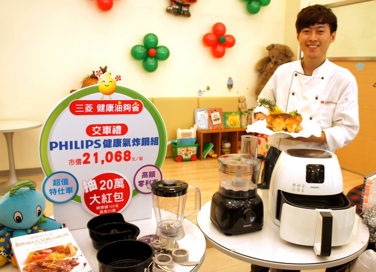 隨著聖誕佳節及跨年時刻即將到來,計畫好如何準備歡樂聚會美食了嗎?近年來食安問題不斷,在家享受DIY料理樂趣蔚為風氣,中華三菱照顧車主健康,本月入主限定車款即贈市價21,068元的「飛利浦氣炸鍋料理組」(含第二代飛利浦氣炸鍋、飛利浦廚神料理機、蛋糕模組及食譜),並特別推出『三菱健康廚房』活動,邀請型男主廚陳秉文老師及俏麗主廚郭馥瑢(咚咚)老師到場教學,兩大主廚將教您用健康氣炸鍋做出一道道省時、減油又健康的五星級美味料理,還有親子DIY料理活動,邀您一同大展廚藝,輕鬆享受百變健康料理樂趣。
