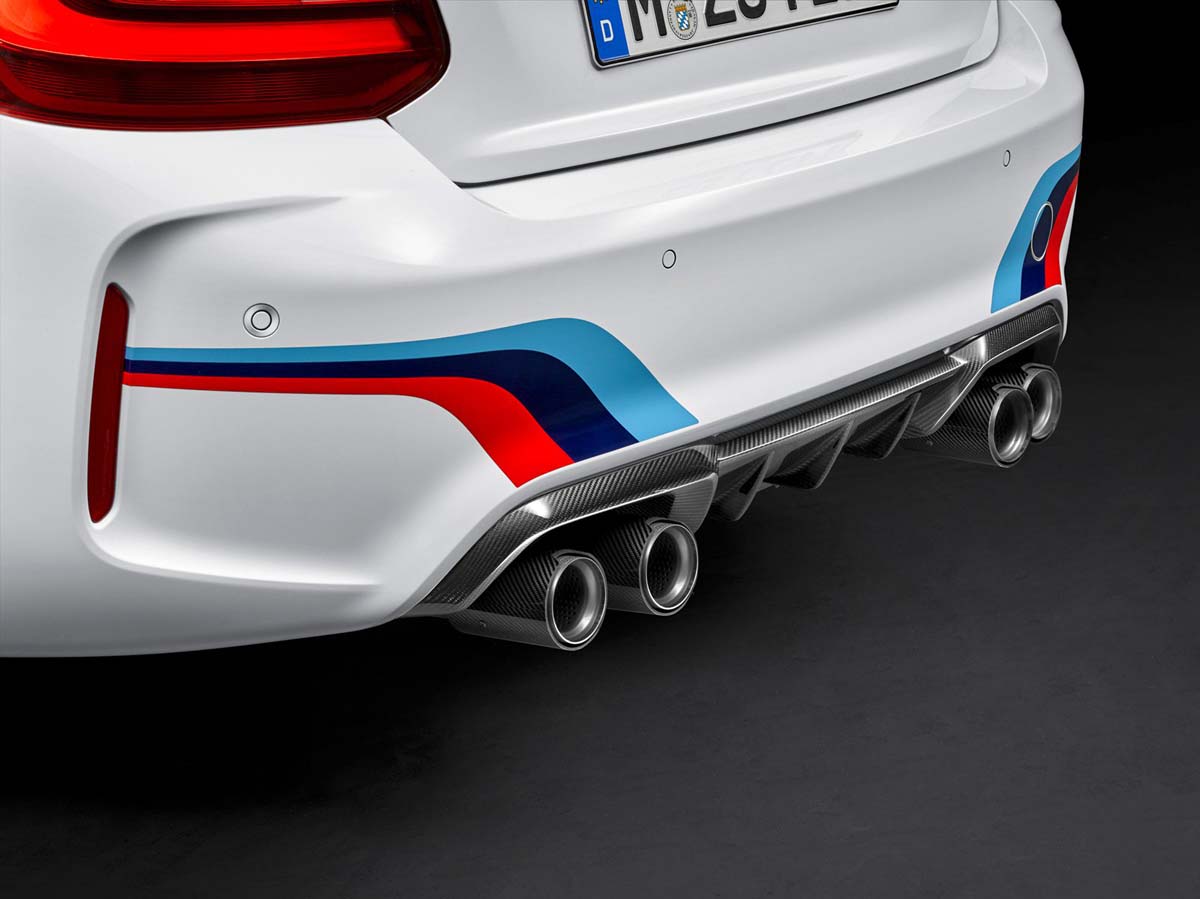 | 針對M2 Coupe部分,同樣也是推出了避震器、音浪可變的排氣管,而碳纖維外觀件的部分有後鴨尾翼、照後鏡外蓋以及側裙後方的定風翼,這組M2 M-Performance套件預計在2016年的春天正式上市。 |