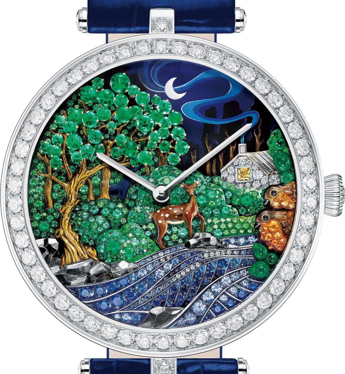 講到說故事,誰人比得上梵克雅寶?品牌多次將奇幻故事與靈動雀鳥搬上腕錶。而今年香港錶展,品牌也一連推出多款以童話故事、花卉與飛鳥為設計靈感的腕錶。而這次又以童話故事《驢皮公主》為主題的Peau dAne Foret enchantee腕錶最為吸睛,珠寶工匠以6個不同層次的平面疊加,每層都有其獨特的鑲嵌寶石與技法,將各色寶石化為故事中的場景,也讓人見識到梵克雅寶處理寶石的高超技法