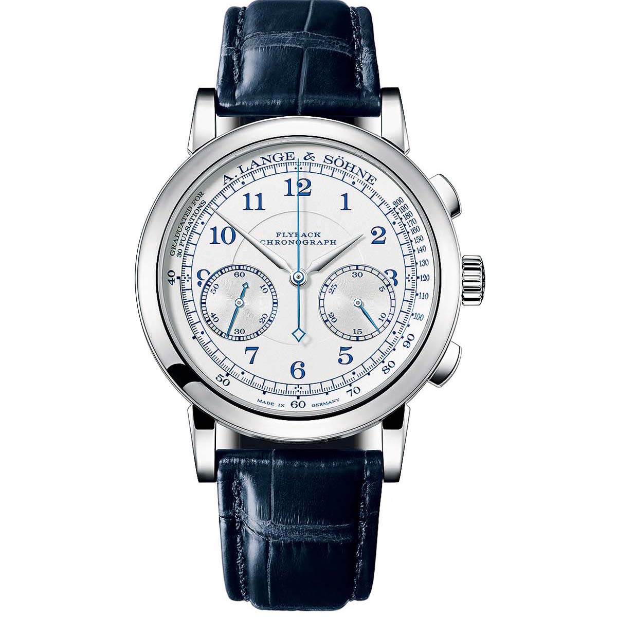 | L951.5自製計時機芯/手動上鏈/60小時動力儲存/時、分顯示,附停秒裝置小秒盤/跳分積分盤和飛返計時功能/脈搏計刻度/18K白金錶殼/實心銀錶盤/藍寶石水晶鏡面和底蓋/僅限專賣店獨賣 |