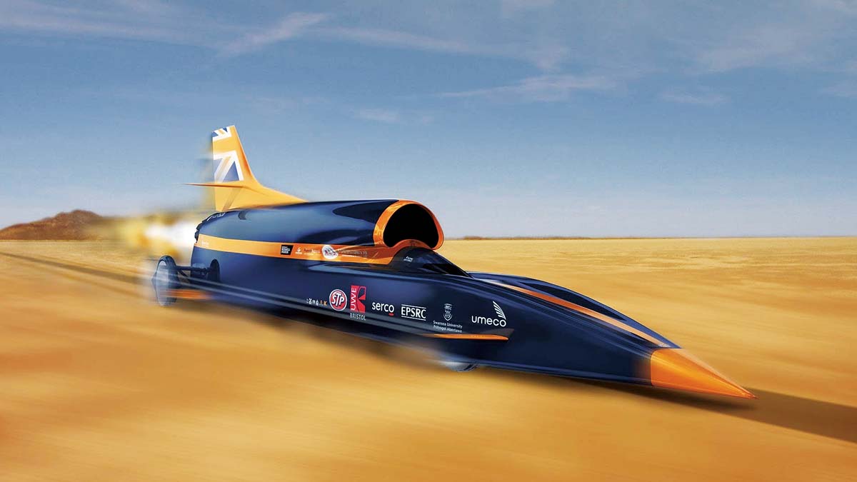 | 以V12內燃機、颱風式戰鬥機噴射引擎外加固 / 液態混合燃料火箭共組動力單元的Bloodhound SSC,目的只用於挑戰1609km/h(1000mph)! |