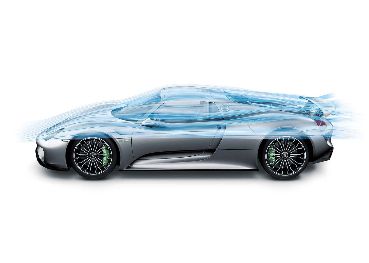 | Porsche 918 Spyder擁有主動式空力套件,可於平常關閉車底進氣孔道降低風阻,高速時則打開增進吸地效率。 |