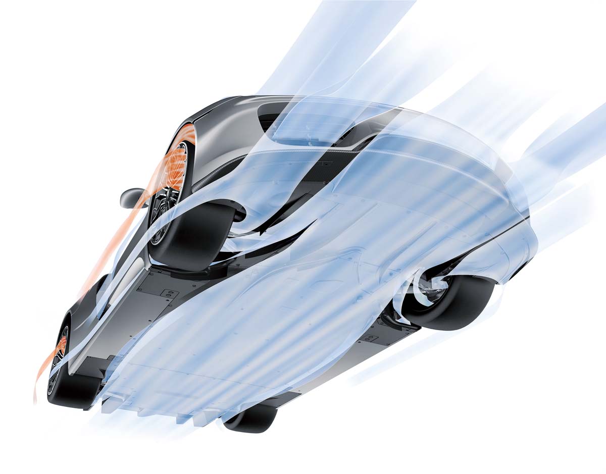 要探討車輛極速,甚至每當鑑賞一款嶄新超跑,許多人第一時間立刻會聯想到從動力系統方向出發,確實,一部車要能跑,引擎與傳動當然是至關重大的部分,不過從一個世紀前到現在,更大的輸出從來就是人類不斷追求的境界,在早年內燃機科技尚不成熟時,便可利用擴充排氣量的方式放大動力輸出。時至今日,對於造車成本比較無需錙銖必較的超跑來說,無論Old School思維的多缸大引擎(像是Lamborghini Aventador與Ferrari F12berlinetta)、瘋狂增壓的強制進氣(例如久佔最速量產車榮銜的Bugatti Veyron 16.4 Super Sport或是小排量大輸出的McLaren 675LT),甚至油電複合的狂推猛送(好比由McLaren P1、Porsche 918 Spyder或Koenigsegg Regera所帶起的新世代油電超跑大戰),都得以輕而易舉將輸出擴充至令人瞠目結舌的範疇,如果只是想要突破300km/h關卡,以現今的科技程度來說一點不算難事,真正的考驗,其實反倒出現在如影隨形綁手綁腳的油耗與排污規範!