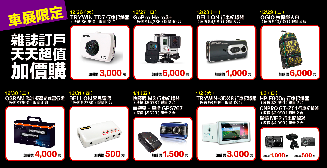 為回饋讀者,凡當日現場訂閱一手車訊或改裝車訊一年份(NT 1,900元)即可以最低市價1折加購行車記錄器等商品,訂購兩年即可免費獲得5000元以下的加購商品(需與原訂戶贈品二選一),每日限量商品組數不同,賣完為止。