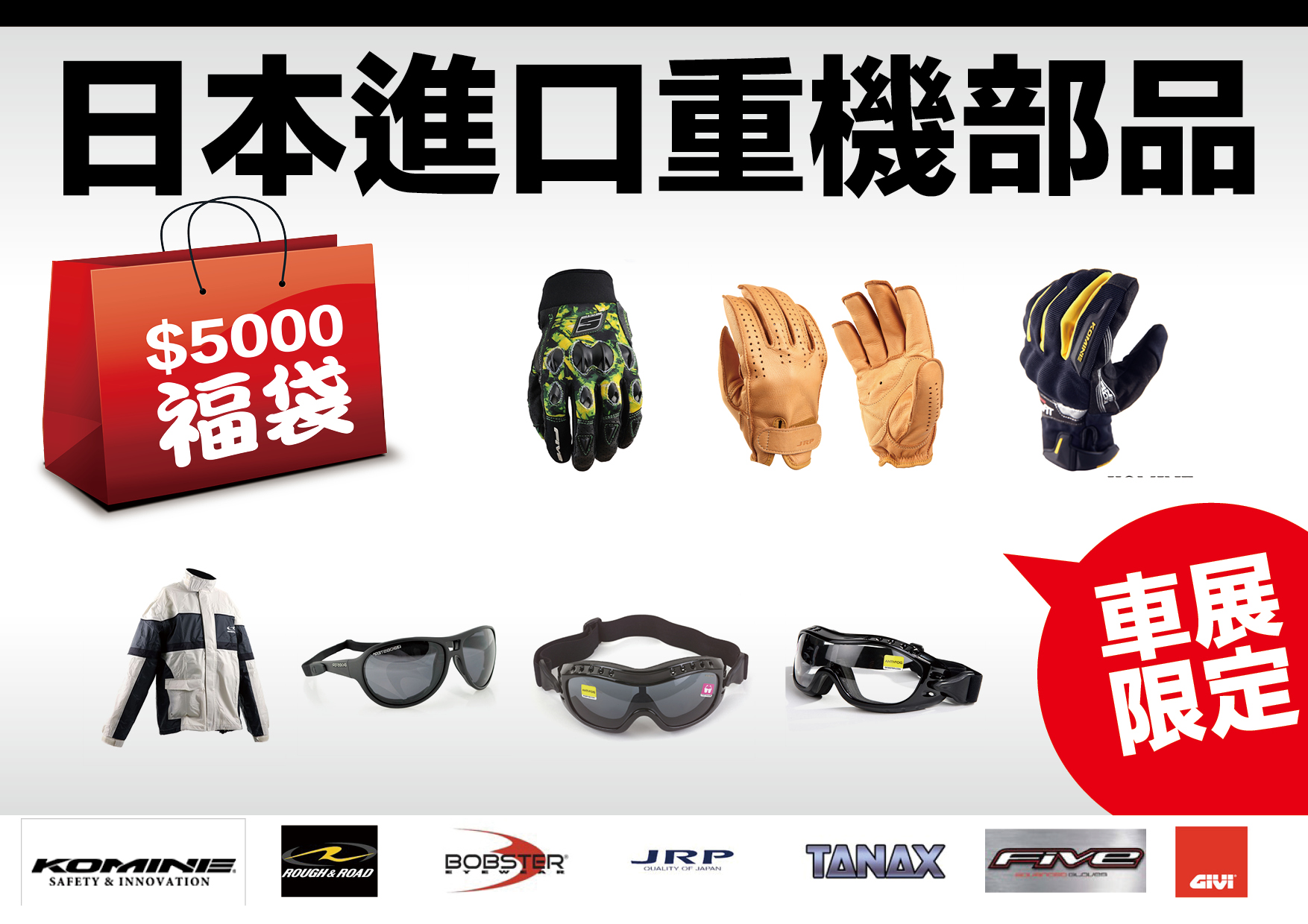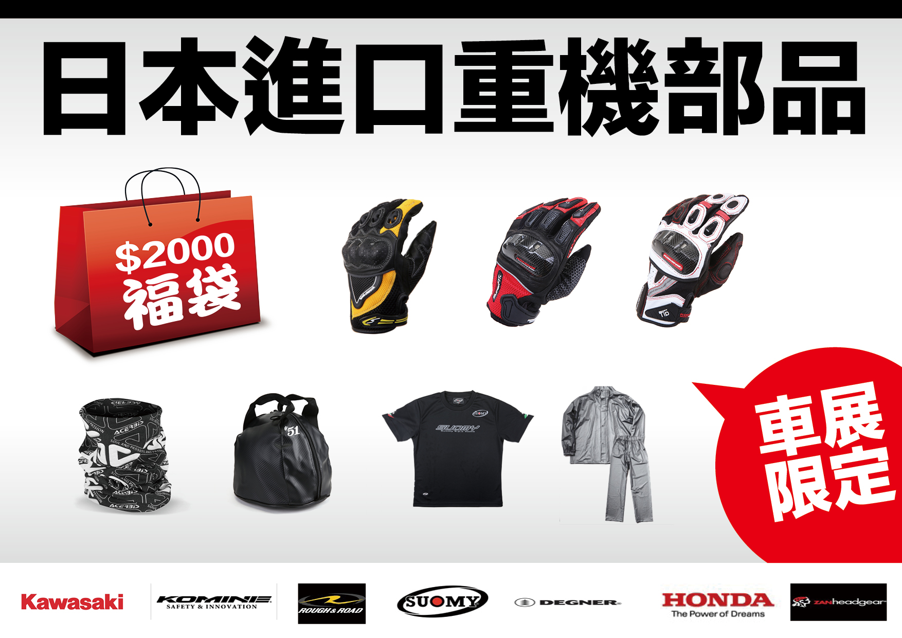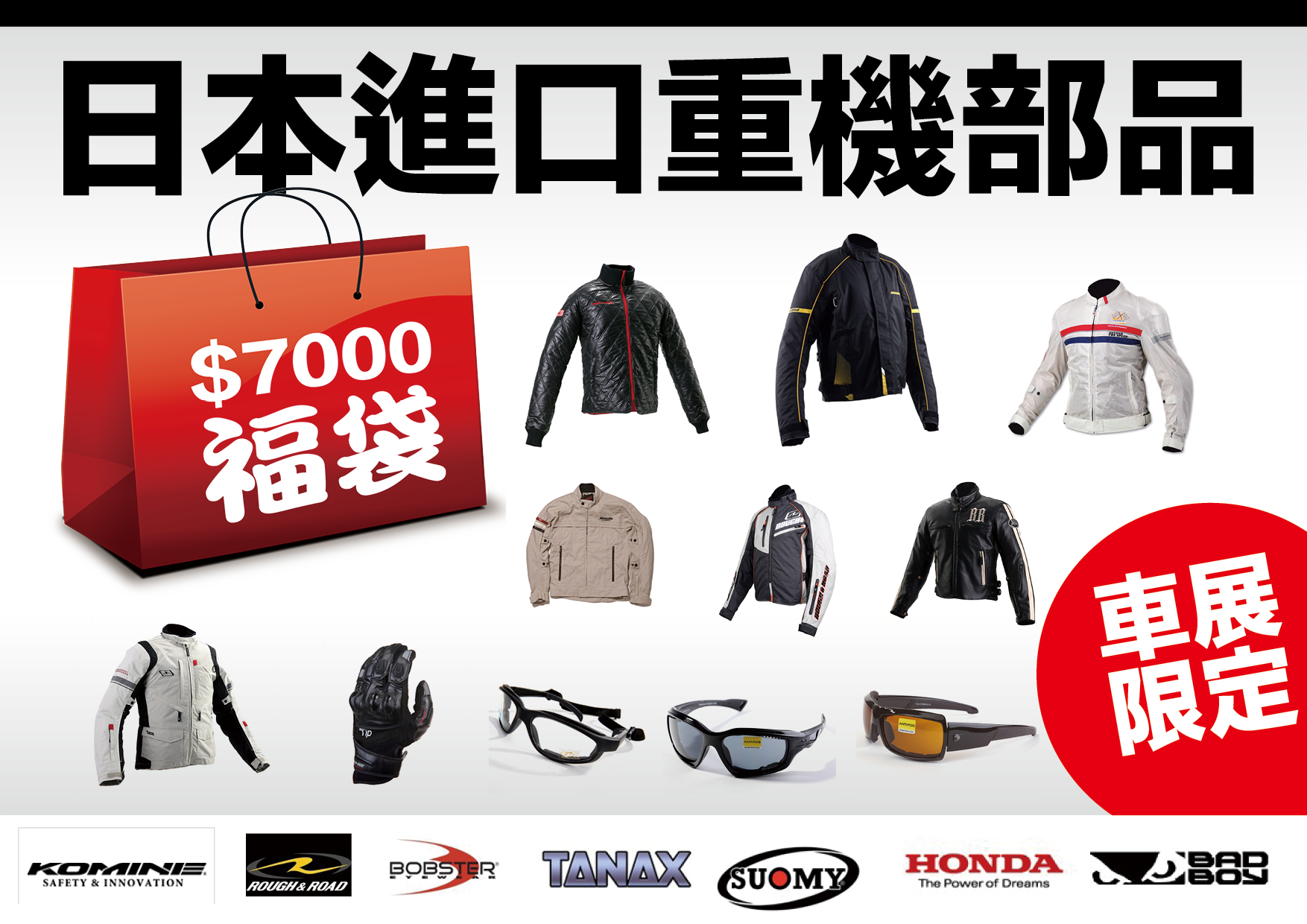 日本原裝進口重機裝備品牌福袋車展獨賣,包括KOMINE、ROUGH&ROAD、HONDA、SIMPSON、TANAX、BOBSTER、KAWASAKI等知名品牌,防摔背心、皮衣、防風外套、真皮手套、眼鏡多樣商品組合,現場都以原價六折價格提供限量福袋,金額從7000、5000到2000不等,逢車展六日(12/26、12/27、1/2、1/3)販售,上午10點開賣,數量有限預購從速!