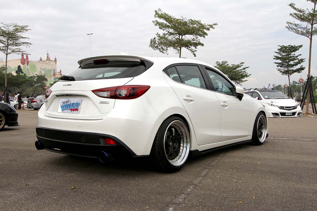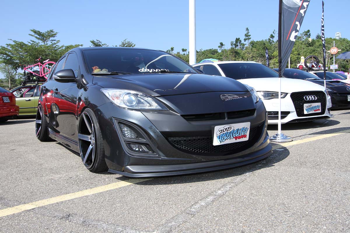 | 這部現場唯一的三代Mazda 3,雖然輪胎外八角度不大、車高也沒降到最低,不過或許是新面孔加上充滿日系外形風格,即使改裝幅度不大,看起來還是頗為順眼。 |