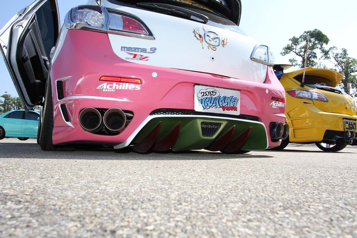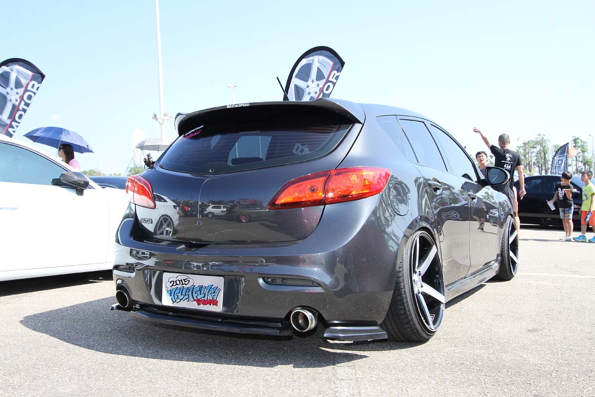 | 這部車算是當天到場的多部二代Mazda 3中,最有海拉風味道的,外觀看不到複雜的彩繪貼紙,車主將重點放在胎圈與定位角度上,車尾比車頭更有看頭。 |