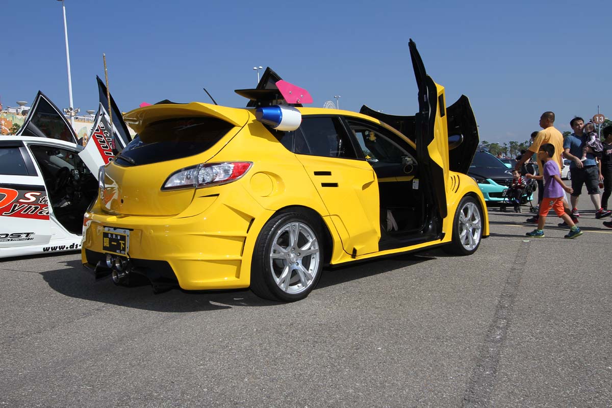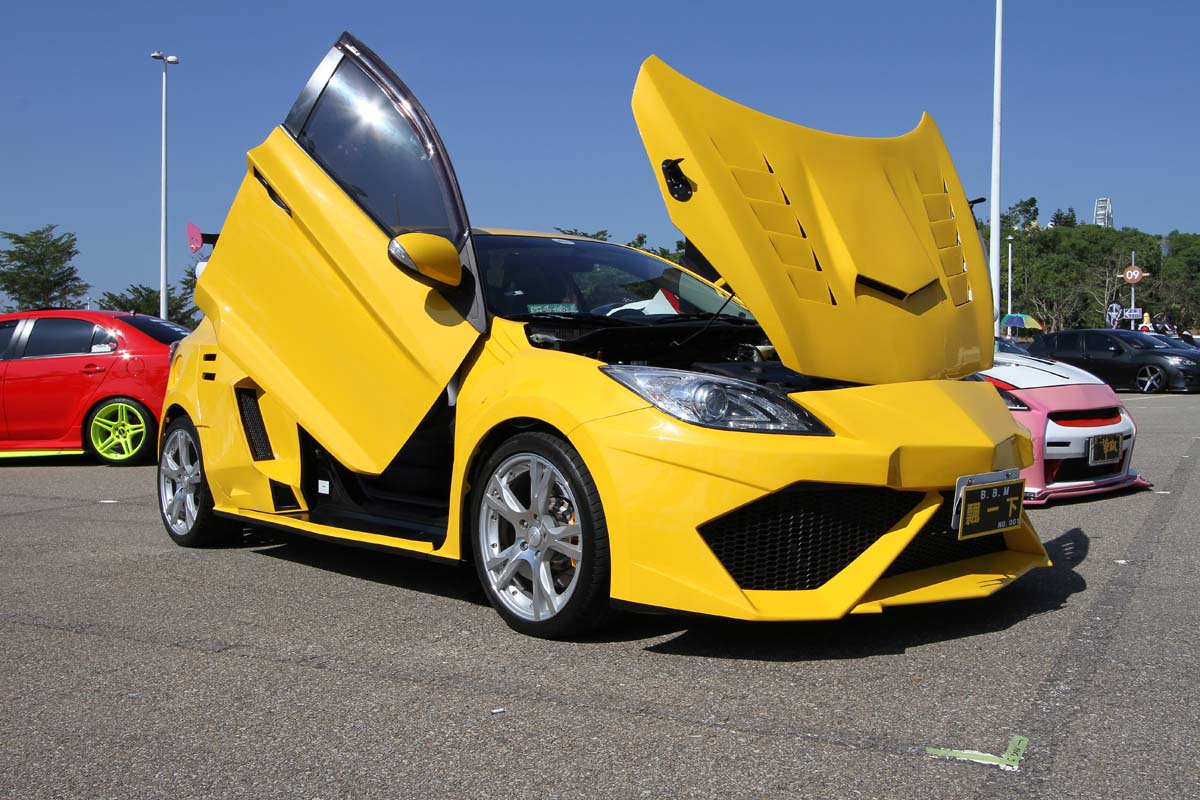 | 這部如同變形金剛的二代Mazda 3,過去也曾在其他聚會上看過其身影,獨特的車門/引擎蓋開啟方式,加上全車寬體空力套件改造,特殊改裝手法讓人留下深刻印象。 |