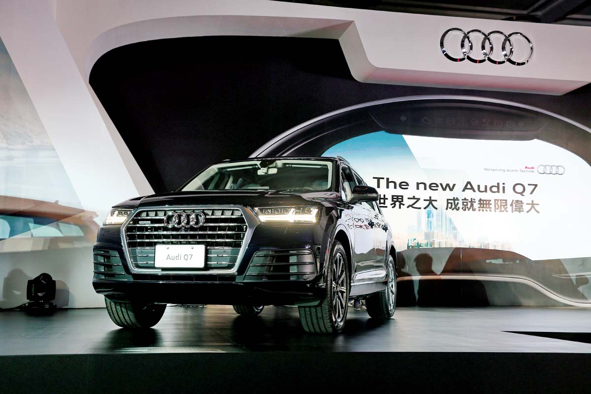 自2005年開始販售的第一代Audi Q7,在全球市場下創下55萬部的銷售佳績,而於11月,全新大改款的Audi Q7正式登台發表。在外觀上,以全新鍍鉻盾型水箱罩,搭配全新的雙箭頭矩陣式LED極光頭燈組,彰顯車頭的自2005年開始販售的第一代Audi Q7,在全球市場下創下55萬部的銷售佳績,而於11月,全新大改款的Audi Q7正式登台發表。在外觀上,以全新鍍鉻盾型水箱罩,搭配全新的雙箭頭矩陣式LED極光頭燈組,彰顯車頭霸氣姿態,而透過頭燈極線連接腰線至LED尾燈組,整體立體、飽滿的線條,更令全新Q7有著穩重、洗鍊的感受。全新Q7在全新的二代MLB模組平台下,透過眾多輕量化複合材質,除了剛性較前代更優異之外,更大幅減輕車重達325kg,並搭配最大動力333hp/44.9kgm之3.0升TFSI、與272hp/61.2kgm之3.0升TDI引擎,透過Tiptronic 8速手自排,0~100km/h分別可達到6.1 / 6.5秒(五人座)之優異表現;除此之外,本次新Q7新增2.0升直列四缸引擎40 TFSI車款,擁有252hp/37.8kgm的最大動力,令新Q7戰線更為寬闊。