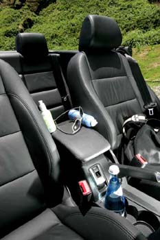 嚴格來說,開篷出遊其實要準備的裝備比普通車輛出門稍微多一些,一副有型的太陽眼鏡是大家都想得到的重要配備,若要長途開篷行駛,得注意的事項還更多些。防曬油是男性很容易忽略的必需品,不僅開車上路前得先塗抹,每一個小時還得再「補妝」一次,唯有如此才能確保皮膚不受傷害;相信任何人都不希望在一次愉快的旅途之後,卻換來一個曬得發紅的鼻頭吧?覺得塗塗抹抹很麻煩的朋友們,則不妨試試噴霧式防曬產品。