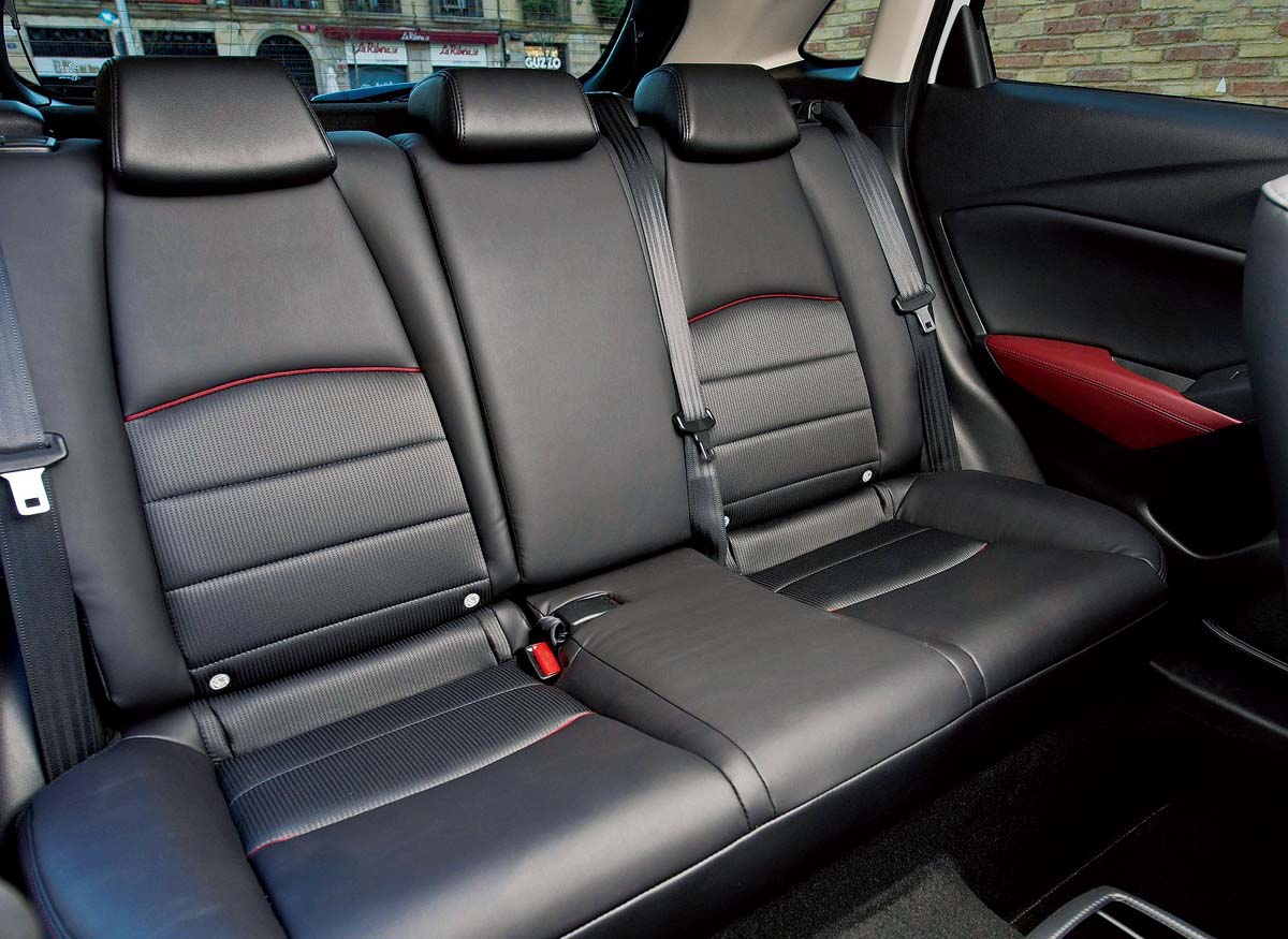 打開車門進入車室,在保有新世代Mazda車款格局的前提下,CX-3擁有更為動感的中控檯風貌,簡單對稱但卻保有駕駛者導向氛圍的設計概念,頗有幾分新世代小跑車MX-5的感受,而由於軸距僅有與Mazda 2完全相同的2570mm,因此雖然受惠於車高提昇仍可輕鬆坐進三名成人,但腿部空間相對不算開闊,所幸在6 / 4分離的後座椅背放倒後,依舊可獲得寬廣達1260公升的行李廂容積。