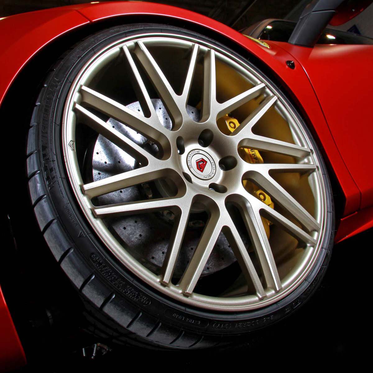 | 全新21吋Vossen鋁圈有著金色塗裝,尺寸更是誇張的前9J、後12.5J,由此可知這輛488 GTB的馬力非同小可。 |