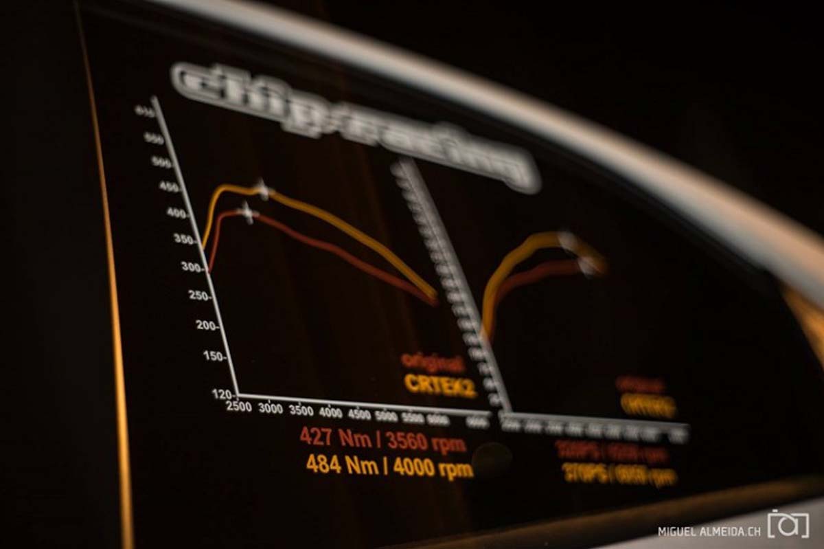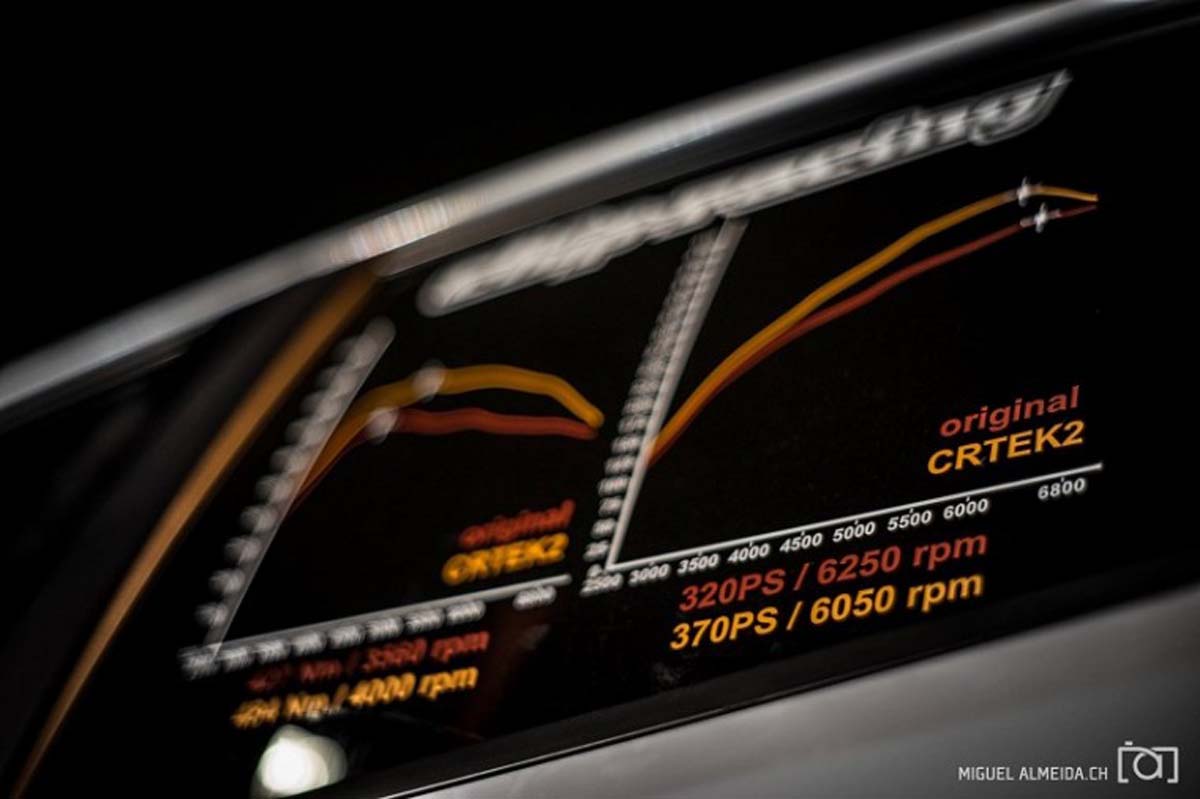 VTEC Turbo有多強?Chip-Racing這次僅針對進排氣做了提升後,搭配自家研發的CRTEK 2 Setting Map,重新設定增壓值與供油、點火後一舉將這顆「K20C1」的出力提升到370ps的幅度,並且將扭力推至49.35kgm,而扭力部分雖然較原廠延後了440rpm,不過以原廠峰值轉速而言,CR370則是能多出4.9kgm的扭力,因此峰值延後幾乎沒有感覺。