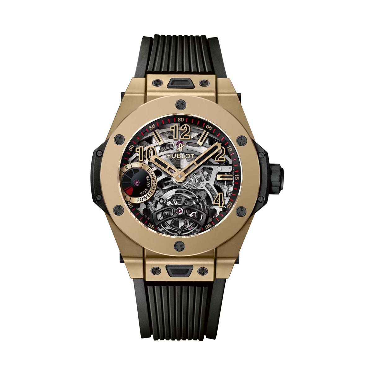 | Hub6016手上鏈機芯/5日動力儲存/錶徑45mm/Magic Gold錶殼/藍寶石水晶鏡面與底蓋/陀飛輪功能/時、分顯示/鏤空面盤/黑色PVD錶冠/價格店洽 |