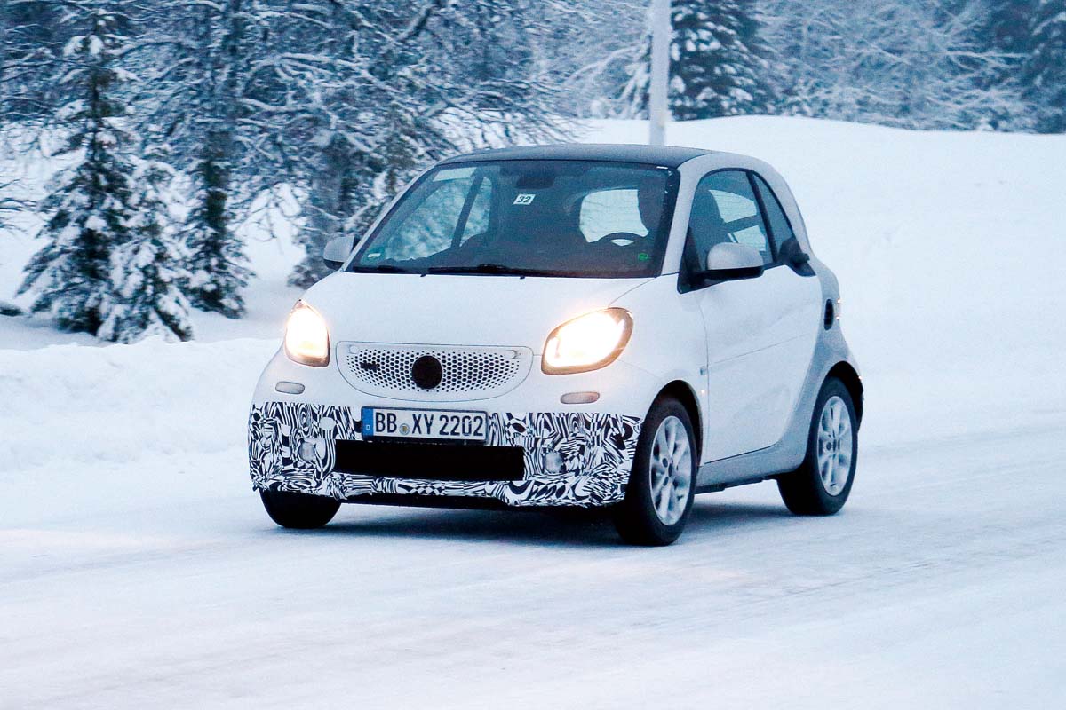 這回一次捕捉到Forwtwo與Forfour兩種車款,但從車尾下方雙邊單出尾管與較寬的後輪胎寬,仍透露出這兩款測試車的車頭將掛上Brabus的廠徽。首先Fortwo的部分,從進氣壩、燻黑燈具,仍可看出Brabus改裝動刀的線索。動力預計將由原先0.9升渦輪增壓引擎榨出額外的20hp~30hp,達到110hp~120hp的水準,更瘋狂的是,Brabus將為Fortwo裝上7速雙離合自手排變速箱,以取代原先的6速自手排變速箱。而在Forfour的部分,從偽裝的前後保險桿可推測將是未來變臉的重點所在,而降高的車身可推論已裝上了運動化懸吊套件,以強化馬力升級後的操控性能。