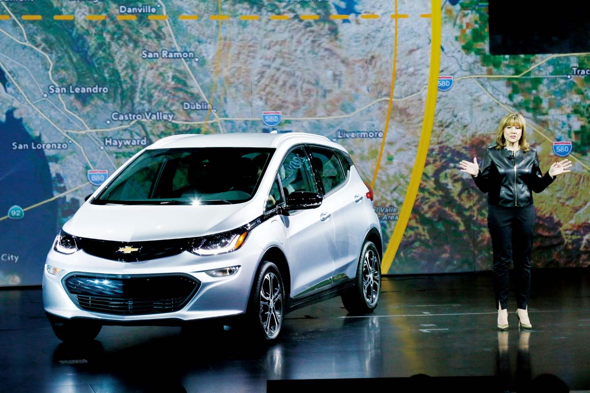 | 時至今日各大車廠無不極為重視如同CES般的電子大展,圖為GM集團CEO Mary Barra以及Chevrolet在CES中所發表的Bolt EV電動車。 |