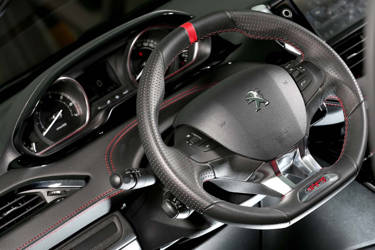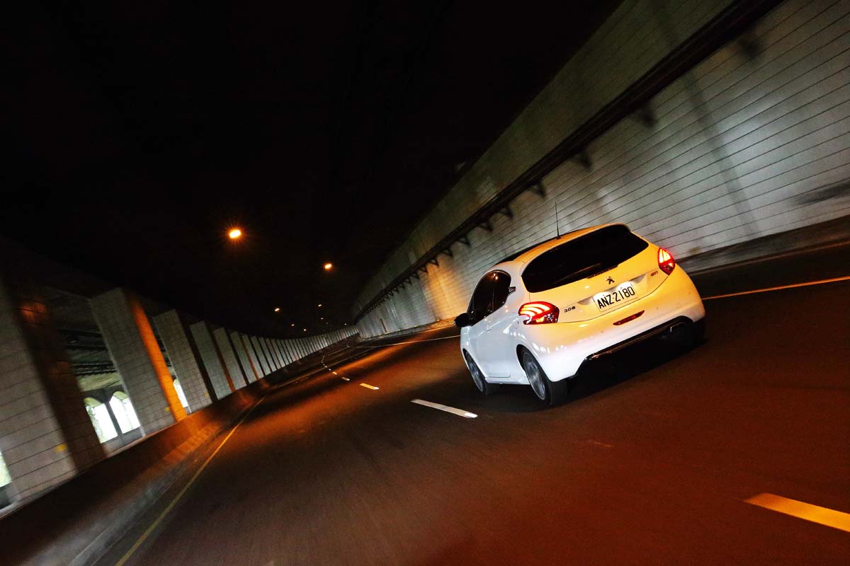 每個路面坑洞及彎道起伏帶給駕駛的感受,Peugeot 208 GTi都不會私藏,因此在台灣其實這個車開來更是需要多份專注,前麥花臣附下A臂及防傾桿搭配上獲得歐洲撞擊評價優異成績的高剛性車體,轉動方向盤就能明確地帶領著車頭往彎道內殺去,EBFD電子式煞車力道分配,與EBA緊急煞車力道輔助系統,都可讓車頭瞬間下沉,轉動方向盤後車頭則可達到更快的反應,後半拖曳臂附扭力桿特殊的滑動特性,也是Peugeot 208 GTi滿滿駕馭樂趣的一大賣點,半滑移卻又安定的表現令駕駛可在安全的速限內得到絕佳的駕駛滿足,安全配備部分Peugeot 208 GTi也沒有偷懶,前座、前座側邊、雙側邊氣簾式SRS輔助氣囊,提供駕駛與乘客最高規格的保障。