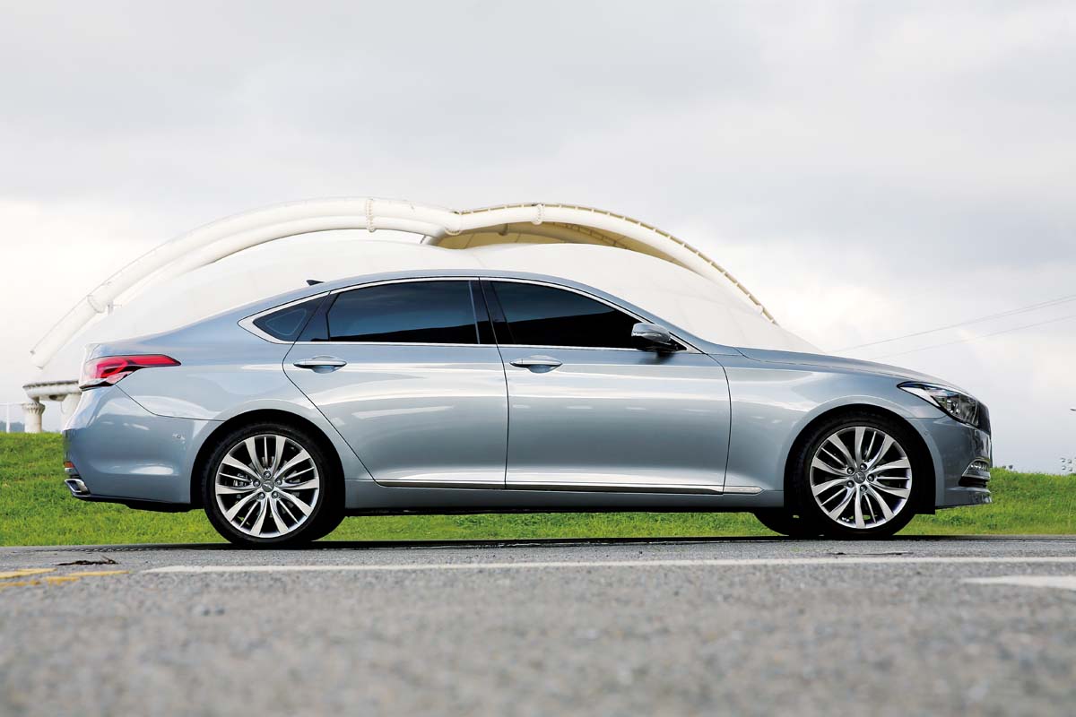 Genesis整體外觀造型上,透過流線設計與底盤平整化設計達到0.26Cd低風阻值,對高速油耗與極速表現都有一定的助益。讓人印象深刻的是,無論車頭造型與長度比例、車身腰線高度、尾燈造型比例,營造出不輸歐系中大型房車的氣勢與辨識度,相信路人就算不認識Genesis廠徽,也能感受到中大型房車所應有、雍容俐落的視覺印象。
