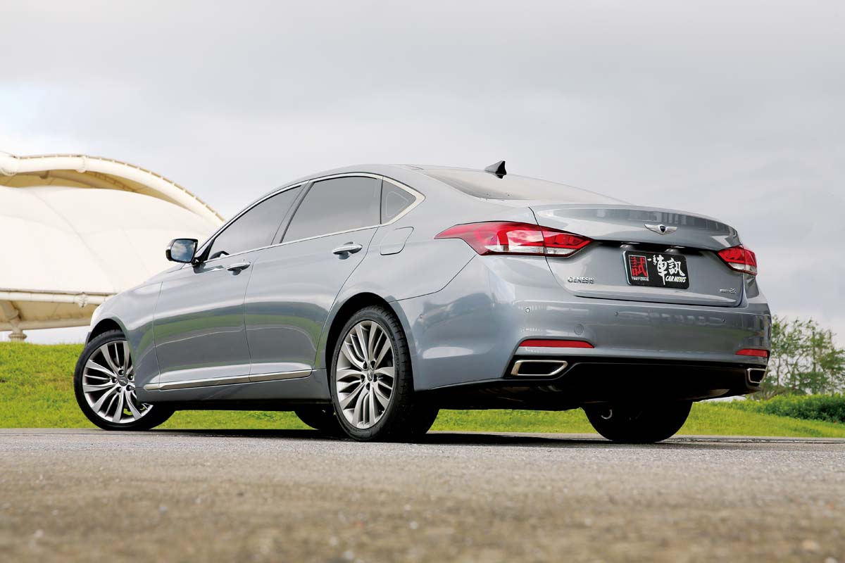 觀察Genesis車側,在3010mm長軸距設定下,相對壓縮了前後懸長度,營造出沉穩大器的風格;搭配車窗鍍鉻飾條與19吋大尺碼鋁圈,在豪華中保有一定的運動化氛圍。一路往後望去,車尾行李廂上方鴨尾造型擾流、車頂鯊魚鰭造型天線、雙邊單出大型鍍鉻尾管,加上醒目的LED冰立方尾燈,車尾設計並不嫌複雜,但同樣呈現出豪華典雅的氛圍。
