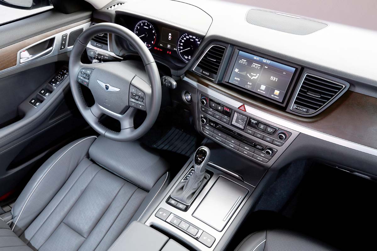 坐進車室,Genesis在內裝採用進口豪華房車上常見的皮革與木質元素,儘管有助提昇豪華感受,但舖陳與設計仍稍嫌保守老派;直到實際試乘駕駛,這種印象才慢慢地開始消解改觀。Genesis除了常見的皮革內裝之外,駕駛艙還可見到類金屬飾板、鋁質內飾板、大面積木紋實木內飾板,以及豪華車款不可或缺的中控檯古典指針鐘。儘管視覺呈現相較質樸、低調,但觸摸接觸時,無論木紋質感、皮椅設計、方向盤握感、扶手角度都設計得恰到好處,用料也相當紮實;彷彿邂逅一位低調不惹眼的紳士,但隱藏內斂光華之下的歷練與智慧,卻不經意地在交流對話中流露出來。