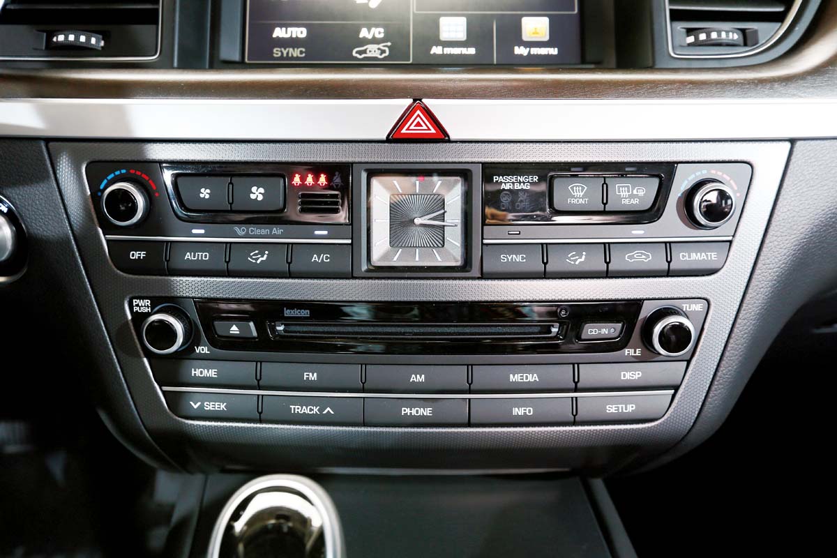 中控檯採用面向駕駛的設計,除了8吋中央觸控影音多媒體,螢幕下方還有三排按鍵,設計佈置相當就手;根據原廠資料,針對駕駛座標準坐姿下,右手到中控檯、中央鞍部按鍵與方向盤快捷鍵的距離都經過精算過,讓駕駛能以輕鬆愜意的姿態控制全車樞紐。但在Genesis駕駛艙中控檯上,舉凡恆溫空調、音響廣播、環車顯影、停車輔助、座椅加熱 / 通風,皆集中在這塊區域上,整體視覺鋪陳稍嫌擁擠,除了需花時間熟悉位置,也不如新世代車款常見的旋鈕設計來得簡潔清爽。