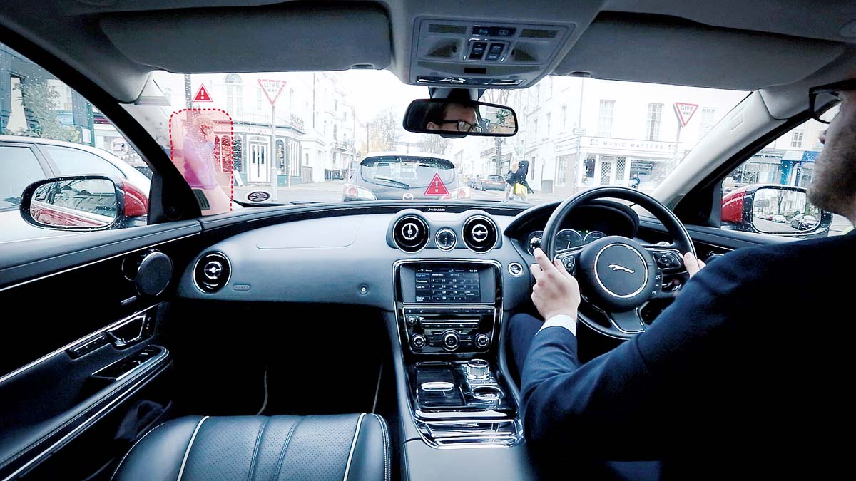 | 汽車工程師也在探索VR(虛擬實境)/AR(擴增實境)技術應用的可能性,較具代表性的成果包括Jaguar-Land Rover集團發表的Transparent Pillar「隱形車柱」與能將建議行車路線、車輛狀態等資訊投影於擋風玻璃的虛擬檔風玻璃系統。 |