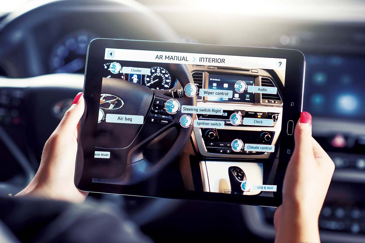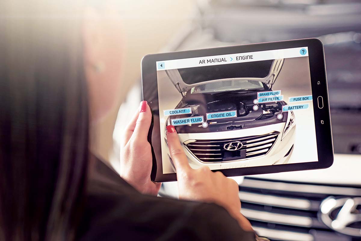 除了行車相關的應用之外,韓國Hyundai也展示了最新結合AR應用的一款「Virtual Guide App」,把傳統汽車維護使用手冊改用AR介面來呈現,提供車主更簡便的汽車維護及保養。車主安裝這個App後,之後透過手機或平板裝置就能使用AR介面,來掃視汽車引擎蓋上的零件,依虛擬手冊上的指示,車主還能用很簡便的方式,很快完成汽車維護保養的工作,既不用再花時間翻閱動輒百頁的維護使用手冊,也大大的改變傳統汽車保養的作法。