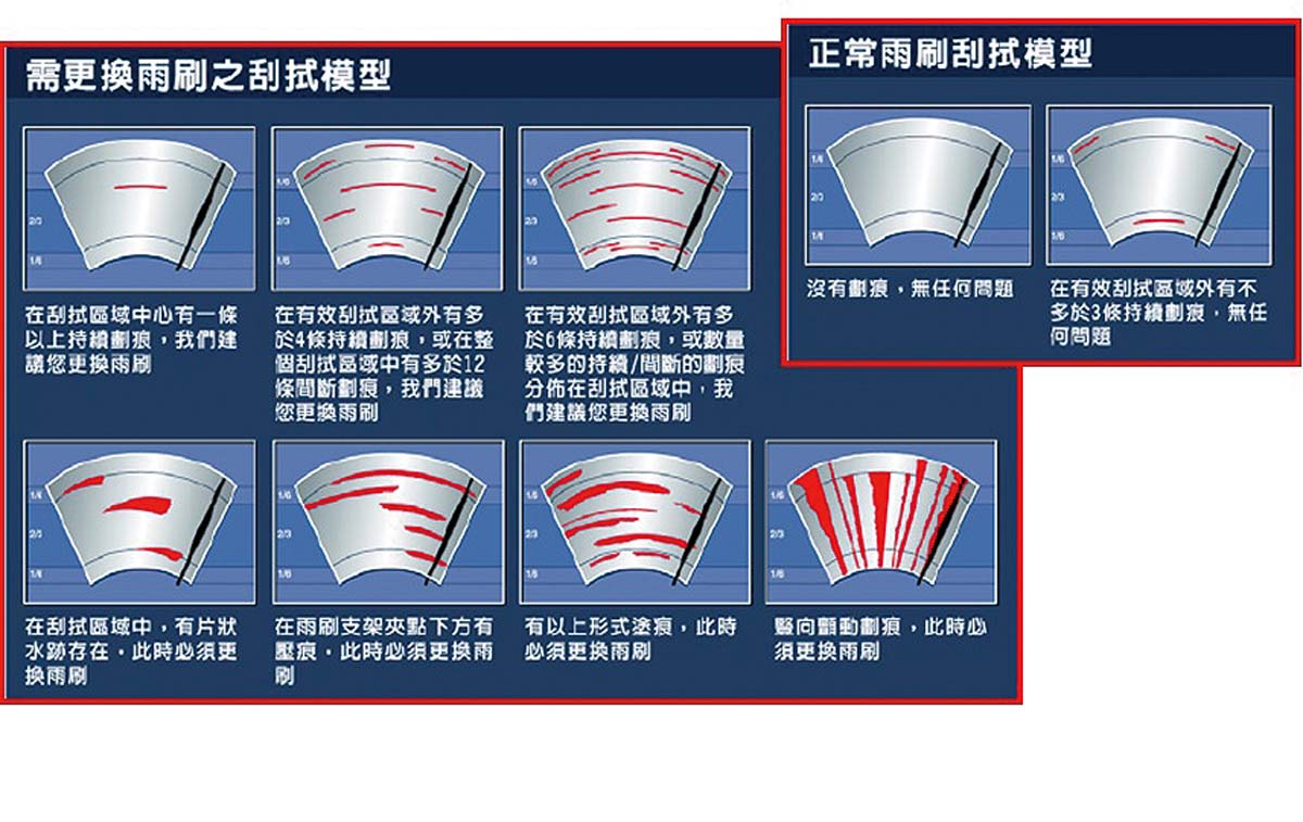 當雨刷刷不乾淨時,一般人大多會直覺認為是雨刷膠條老化所致,但還是有許多其他因素可能造成問題。雨刷長期在戶外風吹雨打日曬環境下,其膠條壽命大約為半年到一年左右時間,當出現一道一道水痕時,大多是雨刷膠條硬化欠缺柔軟度或出現破損等情形,若是覺得擋風玻璃變得模糊,則很有可能原因不在雨刷。當車輛行駛時會接觸到各種汙染,長期下來玻璃便會形成一層油膜,雨刷無法刷拭乾淨時,玻璃就會變得模糊,此時就算更換新雨刷也無法解決,應使用除油膜產品將玻璃油汙清除,平日也可適度添加雨刷精以減少油膜附著程度。而當雨刷出現跳動或是異音時,首先可檢查是否是雨刷膠條老化所致,另外便是檢查膠條與玻璃是否成垂直接觸,若不,則須透過專業儀器才能調整至正確角度。另外,潑水劑的薄膜會吸附油汙灰塵,當薄膜脫落或是玻璃過於乾澀也會造成跳動與異音。