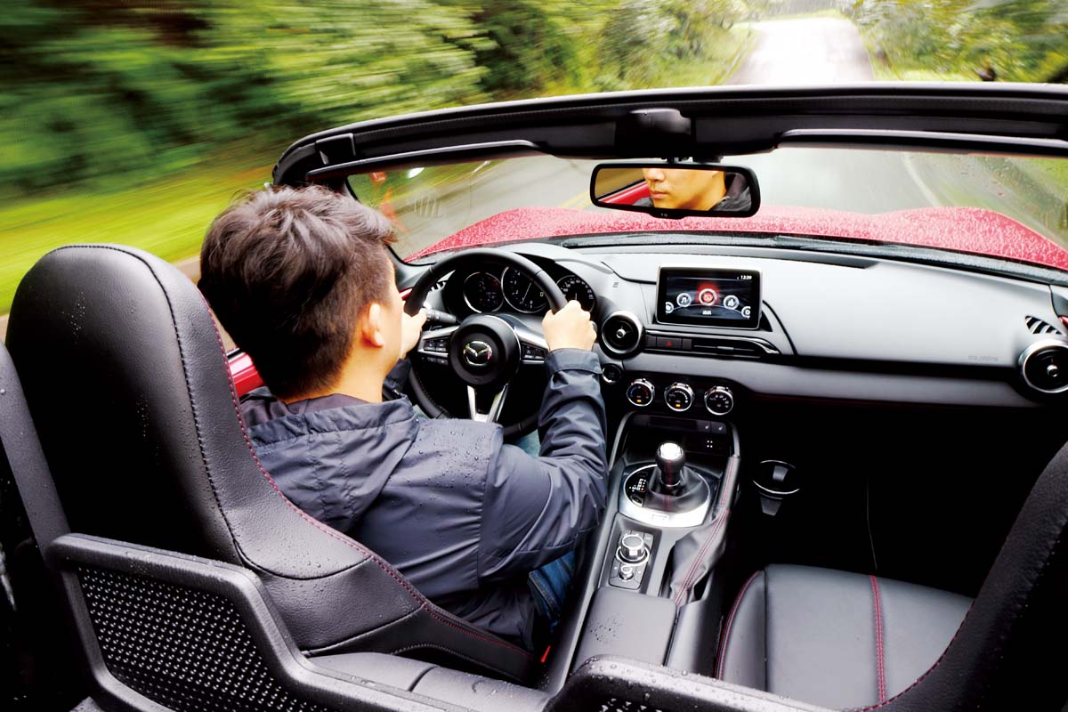 Mzada所推出的新世代車型,除外型亮眼外,內裝的設計與質感也是令人欣賞的部份,即便以駕馭為訴求的MX-5在內裝飾板也賦予皮質包覆,而儀錶平檯雖採硬質處理,但整體壓花做工還頗為精細,並沒有一般硬飾板的廉價感,7吋觸控螢幕與多功能控制旋鈕,更帶來科技感及便利性,圓形排檔桿也帶來像似手排的握感。而就在下車要開門時,我才發現原來車門上緣是採用與同車色設計;少了傳統塑料飾板的鋪陳,冰涼的觸感與視覺則帶來如賽車般的氛圍。就在我四處研究MX-5的配備與裝置時,此時比MX-5還略微低沉的排氣聲浪與輪胎尖叫聲從遠處快速的接近,一部鮮紅的Toyota 86從我眼前疾駛而過。