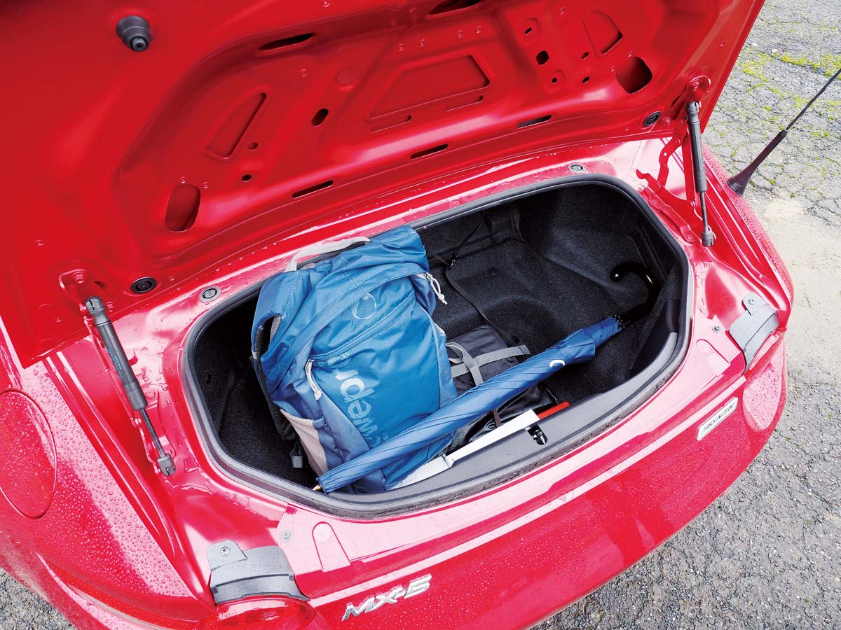 MX-5所帶來的駕馭樂趣會讓人沉醉其中,不知不覺便已跑完山路而來到山頂與同事相約的集合處。在等待的同時,也終於有空閒可以來好好看看剛剛我駕駛的這部車內裝到底有那些玩意兒。在MX-5座艙內最大的視覺焦點則是兩張運動化座椅,因為是敞篷車型所以原廠也很貼心的配置了加熱功能,除此之外就看不見其他任何多餘的乘坐或置物空間,除了那130公升行李廂之外;儘管行李廂不大,但仍可放進20吋登機箱及隨身個人物品,而小空間還有一個好處就是在山路操駕時物品不會滾來滾去。