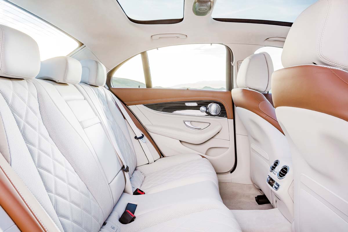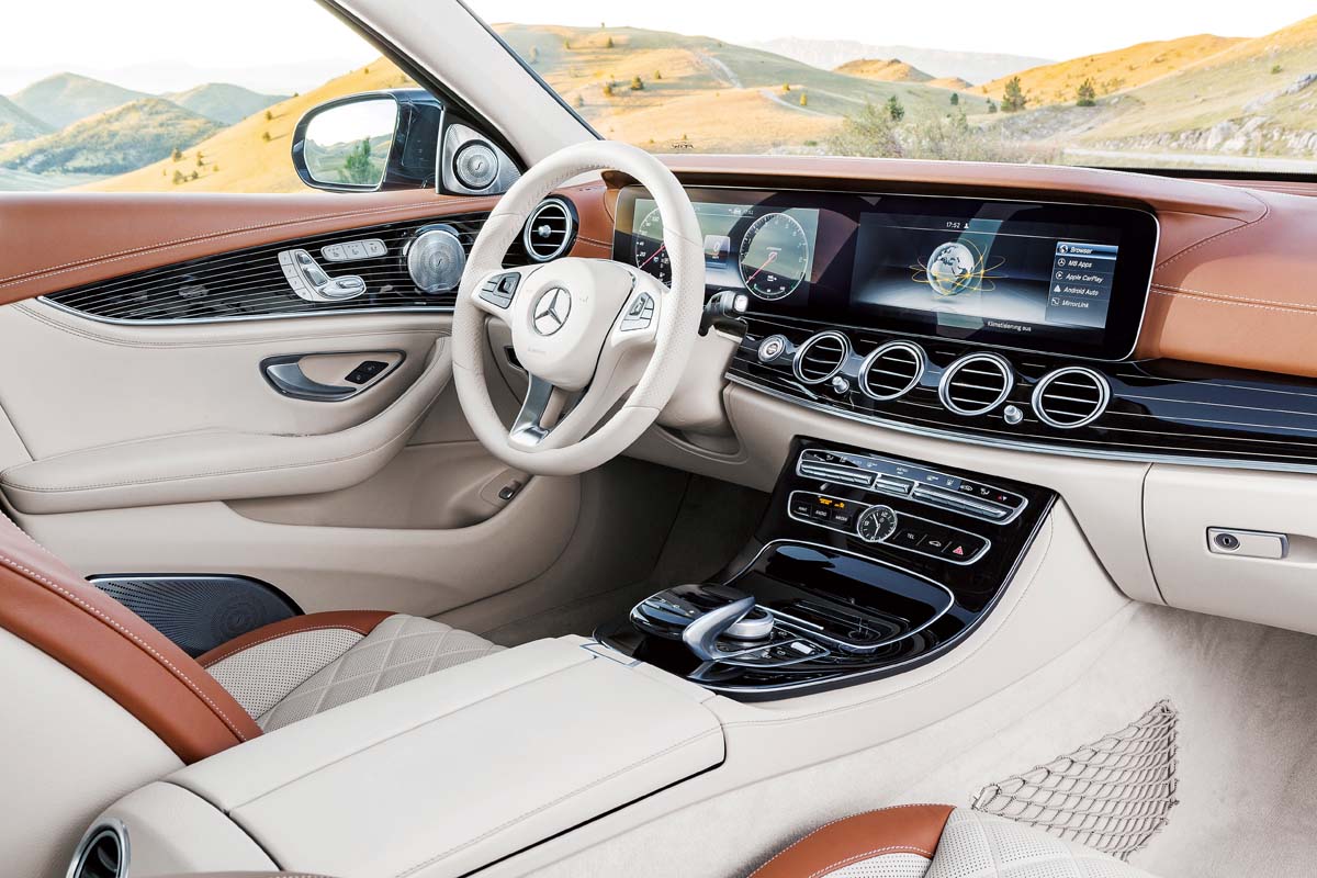 內裝方面,全新E-Class幾乎是與S-Class看齊,極盡奢華質感,最醒目的莫過於首度搭載於此級距的12.3吋液晶螢幕,整合車輛資訊、娛樂通訊與衛星導航於其中,而另一個是首度在汽車上亮相的「Touch Controls」,在方向盤上設計了一個有如智慧型手機的觸控式面板,駕駛者只要用手指水平或垂直於面板上滑動即可,實現手不離開方向盤、眼睛可注視前方的行車安全性。