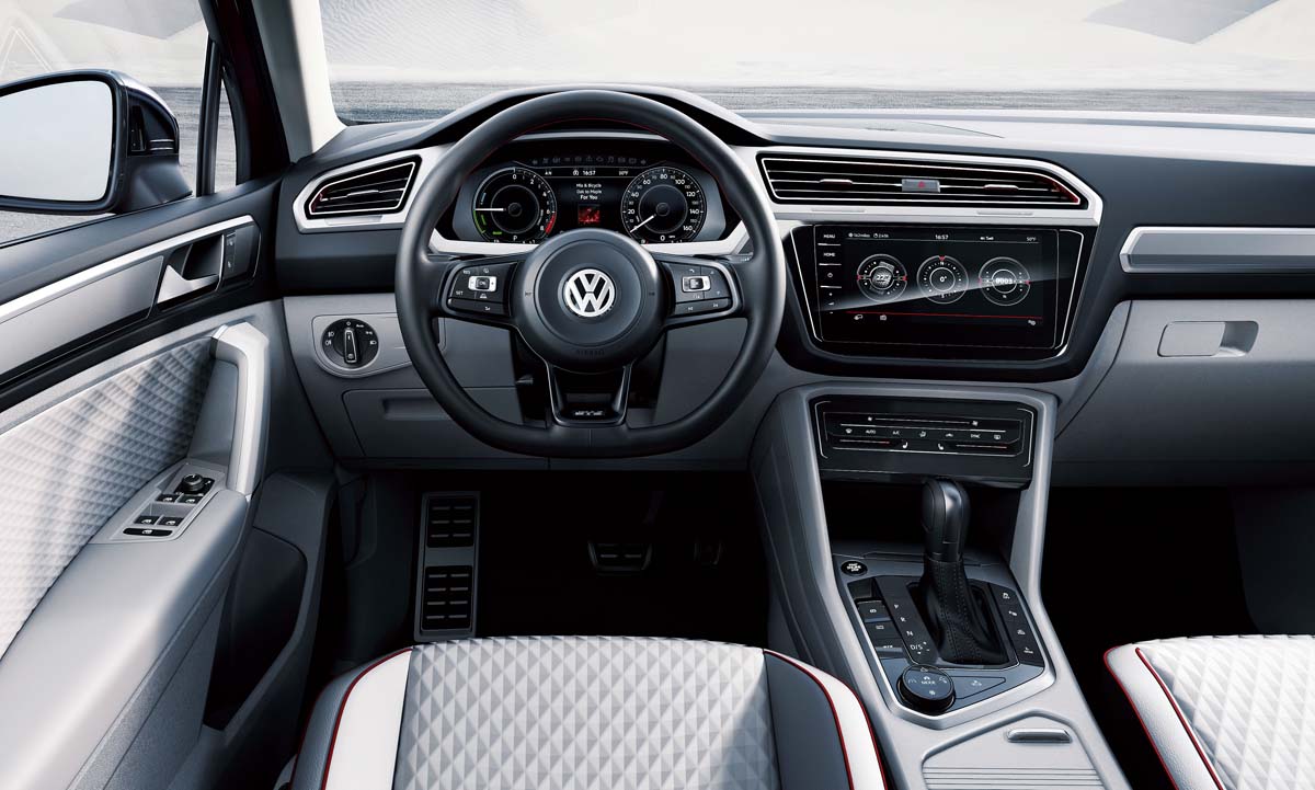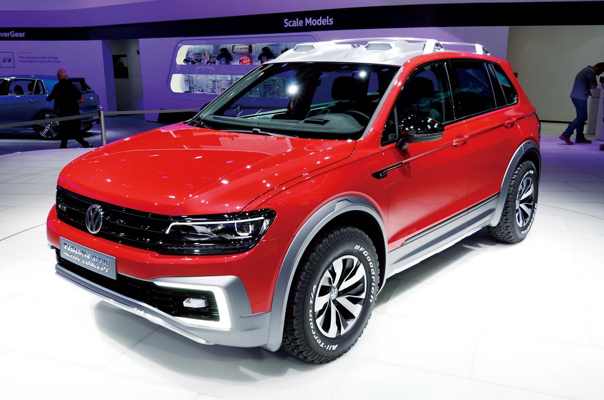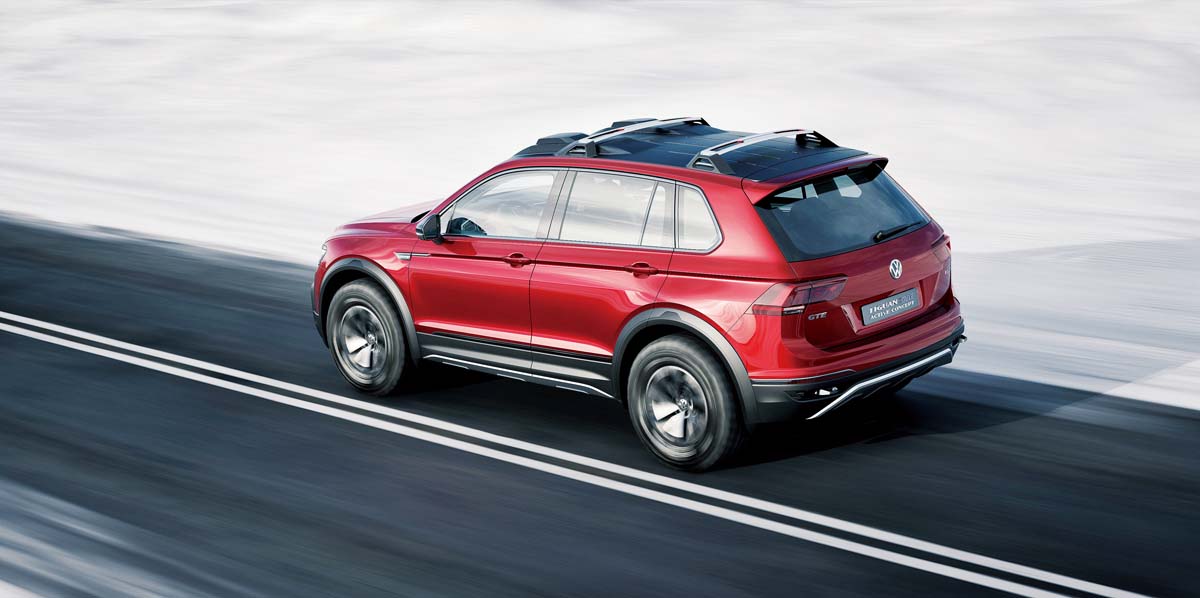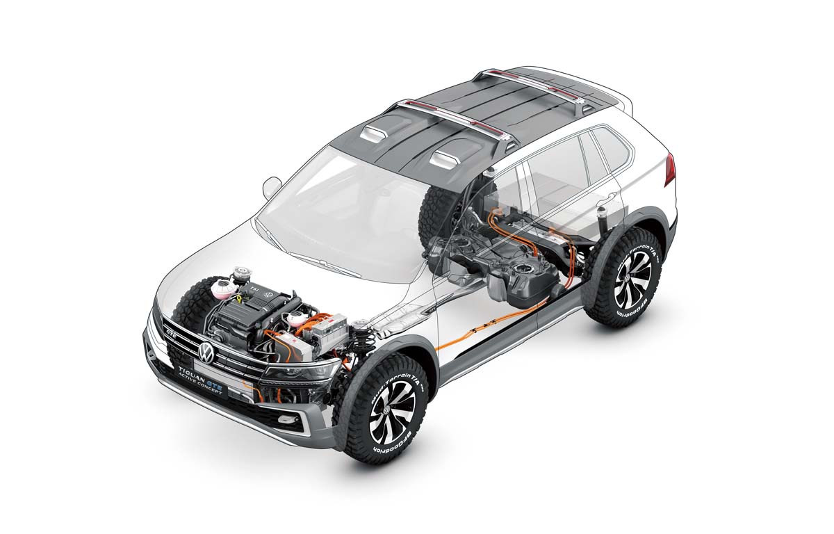 以第二代Tiguan為基礎,打造成插電式油電混合、四輪傳動的Tiguan GTE Active概念車,前輪動力來自一具擁有150hp最大馬力的缸內直噴渦輪增壓引擎,加上一具擁有54hp功率的電動馬達,而後輪是一具可輸出115hp功率的電動馬達,綜效馬力到達221hp,搭配雙離合器自手排變速系統,從靜止加速到100km/h僅需6.4秒。