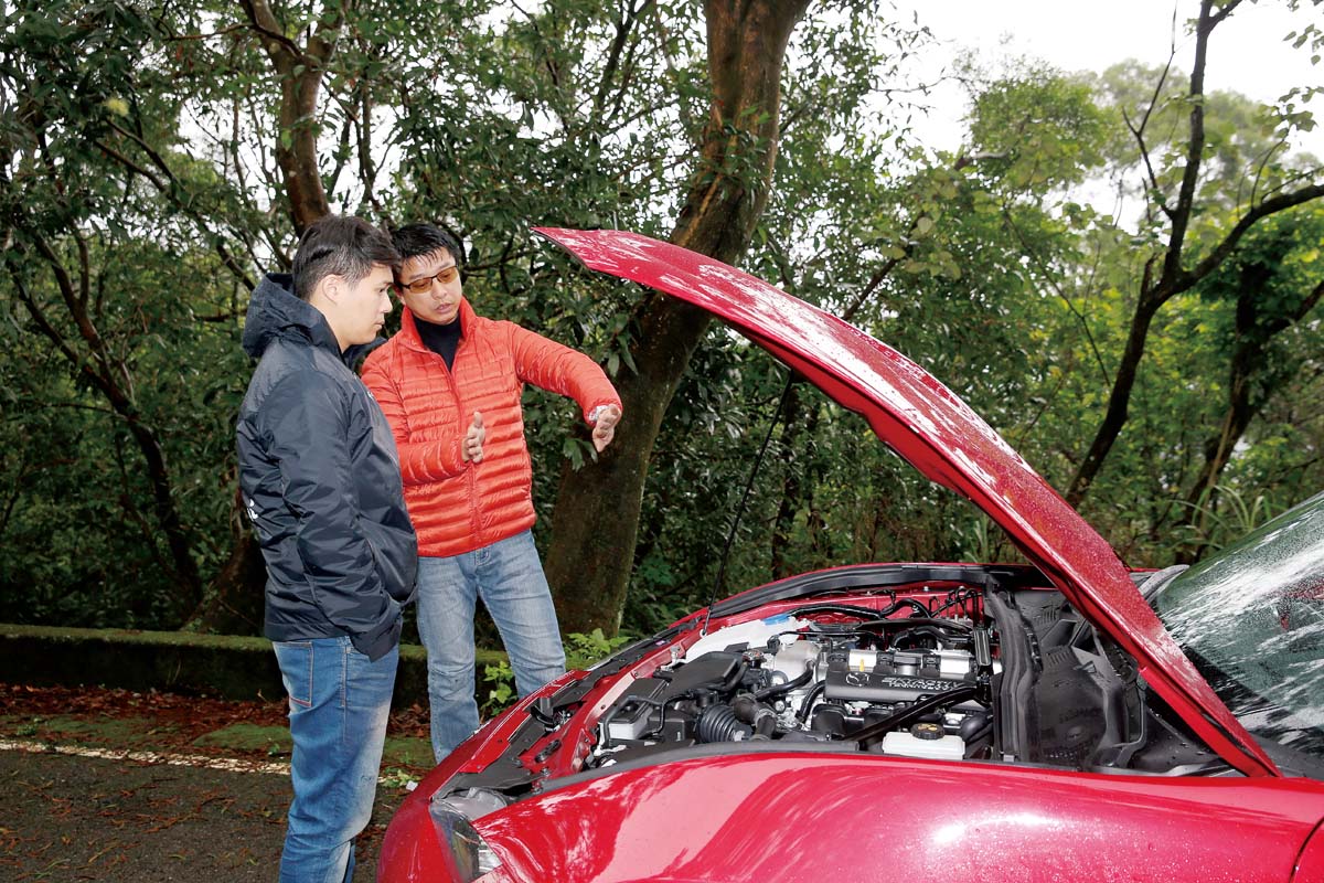 | 曹哥在向我們解釋MX-5引擎配置及未來改裝升級程度。 |