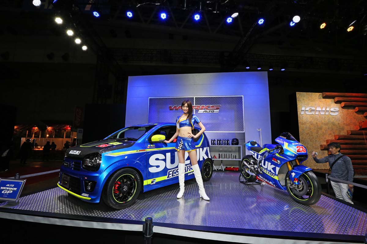 另外一部改裝車款為Alto Works GP,Suzuki原廠以Alto Works進行改裝,在車色外觀採用原廠知名Moto GP車隊活潑耀動的藍色塗裝,引擎蓋也換上碳纖維材質,搭配Alto Works原有的Recaro桶式賽車座椅、運動化的懸吊跟0.66升渦輪增壓引擎,讓Alto Works GP全車充滿競速風格?p>>