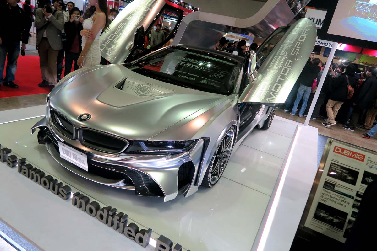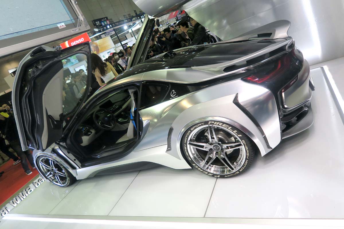 就說改裝無國界了,只要想改什麼車都能改,日本Energy Motorsport推出這輛名為Evo的BMW i8,外觀上大量融入未來科技感,就像之前所推出的i3一樣,前保桿採用極為複雜的線條裝扮,配上外擴的葉子板暴龜,加上消光鍍鉻與碳纖維紋路,感覺就像是從外太空來的未來車,車側可以明顯看出線條從側裙上拉與後葉子板暴龜連接,肌肉感十分明顯,另外,車尾左右邊加了有如提把般的尾翼,下方也增加了有如定風翼造型的擾流板,整體感覺非常科幻,底盤部分改裝21吋BBS鍛造鋁圈搭配Pirelli P Zero輪胎,動力則維持原廠設定。