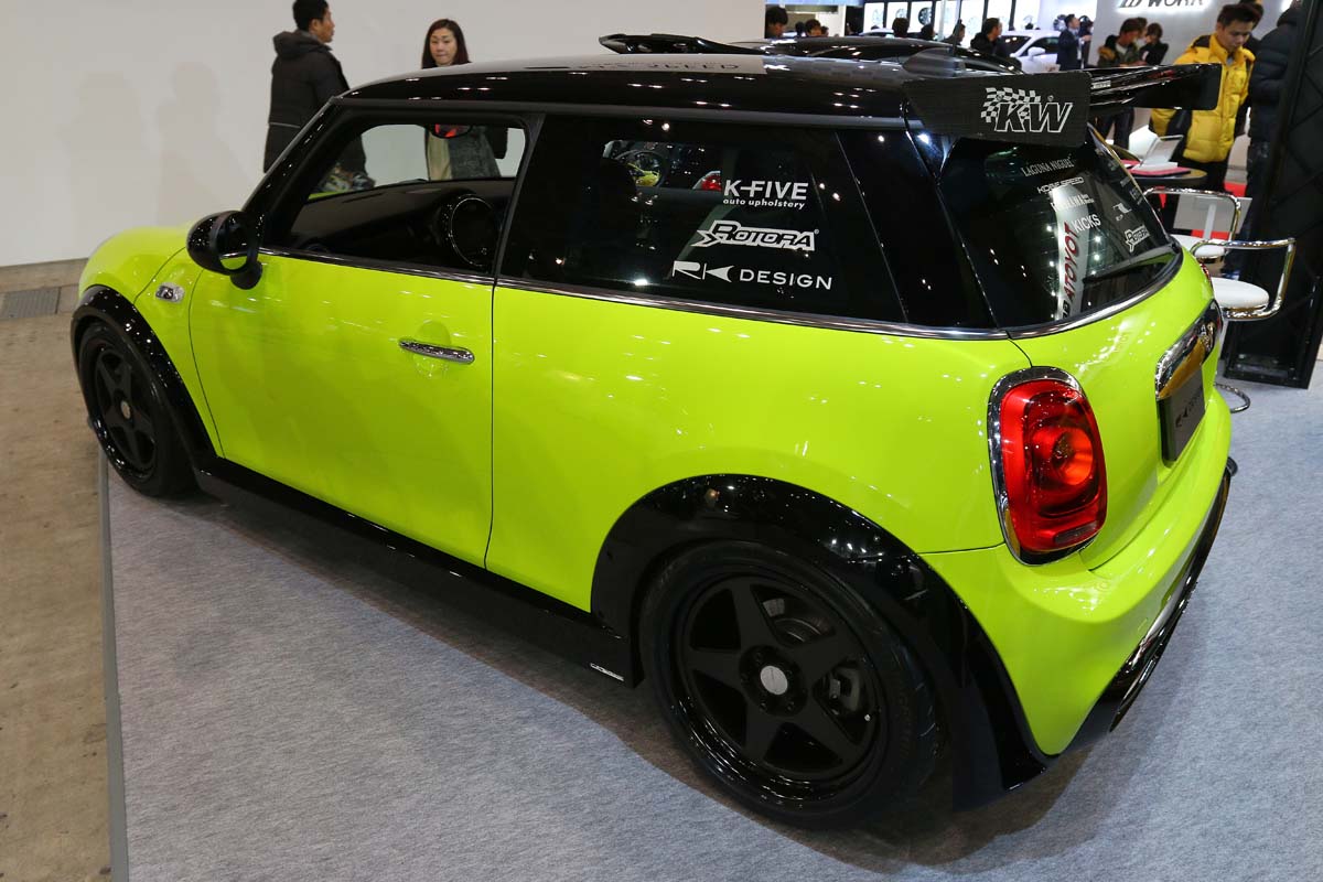 熱門改裝車型永遠不會在改裝車展中缺席,今年RK Design所推出的Mini Cooper S(F56)與Subaru BRZ,相較極為誇張的重度改裝,採用簡單的外觀升級不僅適合低調玩家選擇,結合跑車與時尚的視覺美感已成為入門玩家的首選,首先即將在今年四月上市的F56專屬改裝套件,包含RK Design寬體空力套件、碳纖維尾翼、排氣尾管、KW Club Sports避震器與18吋五幅鍛造輪圈,圓潤而個性化的升級方向也是多數Mini車主喜愛的。另外平價雙門跑車Subaru BRZ,一樣透過小包圍的升級來適度增加運動性,只不過為了塞入Rotora Street Challenge多活塞卡鉗,透過19吋RK Design MS90輪圈與Tanabe避震器降低車高,完全滿足低趴就是時尚。