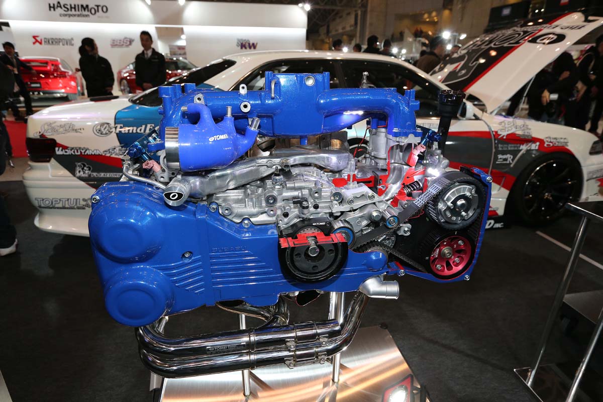 」,這輛在2010年由東名Power及Cusco聯手打造的單圈計測參賽車,主要的動力諸元就是由東名Power來負責處理。採用EJ25本體作為基礎,並且內部全數更換上東名Power鍛造活塞、H斷面連桿及鍛造曲軸施以強化,排氣量也小幅提升100c.c.,汽缸頭部分則也是一併交由東名Power負責,高角度凸輪軸、鈦合金汽門帽與強化彈簧都沒有缺少,最大動力則是上看500ps。