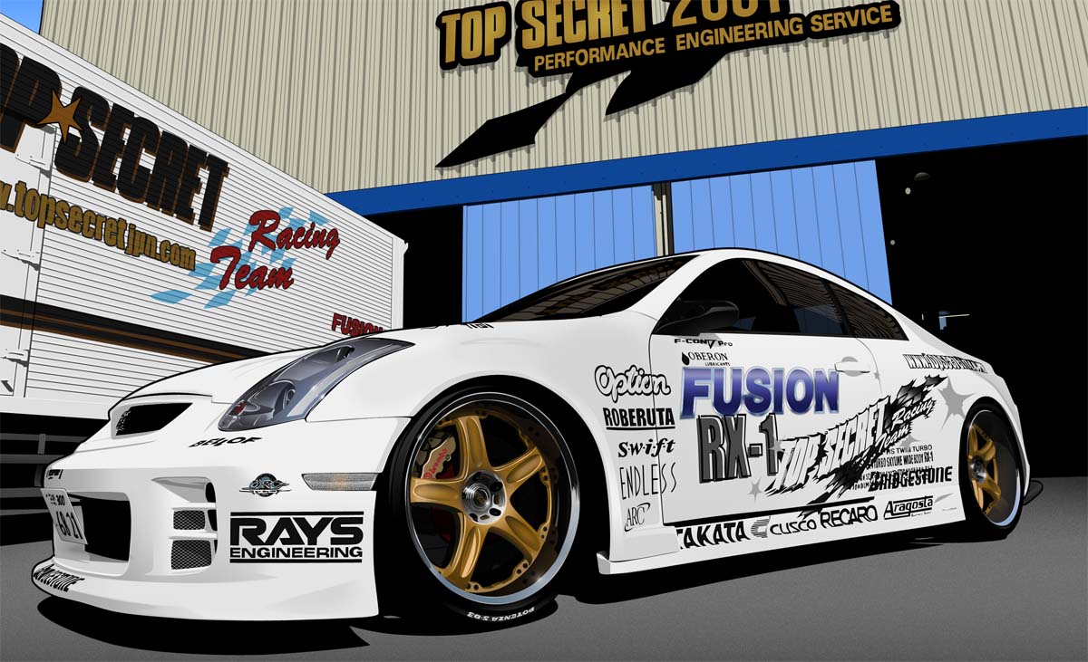 另外一個令人留下深刻印象的就是Top Secret V35GT-R,由於當年R34停產後R35遲遲沒有下文,因此Top Secret才會打造這輛V35GT-R FUSION RX-1,搭載上VK45DE V8引擎加上兩顆渦輪增壓機,在德國無限速高速道路寫下341km/h的紀錄。不過目前Top Secret的最速紀錄則是由Super GTR 1200(R35)的377.246km/h所保持。