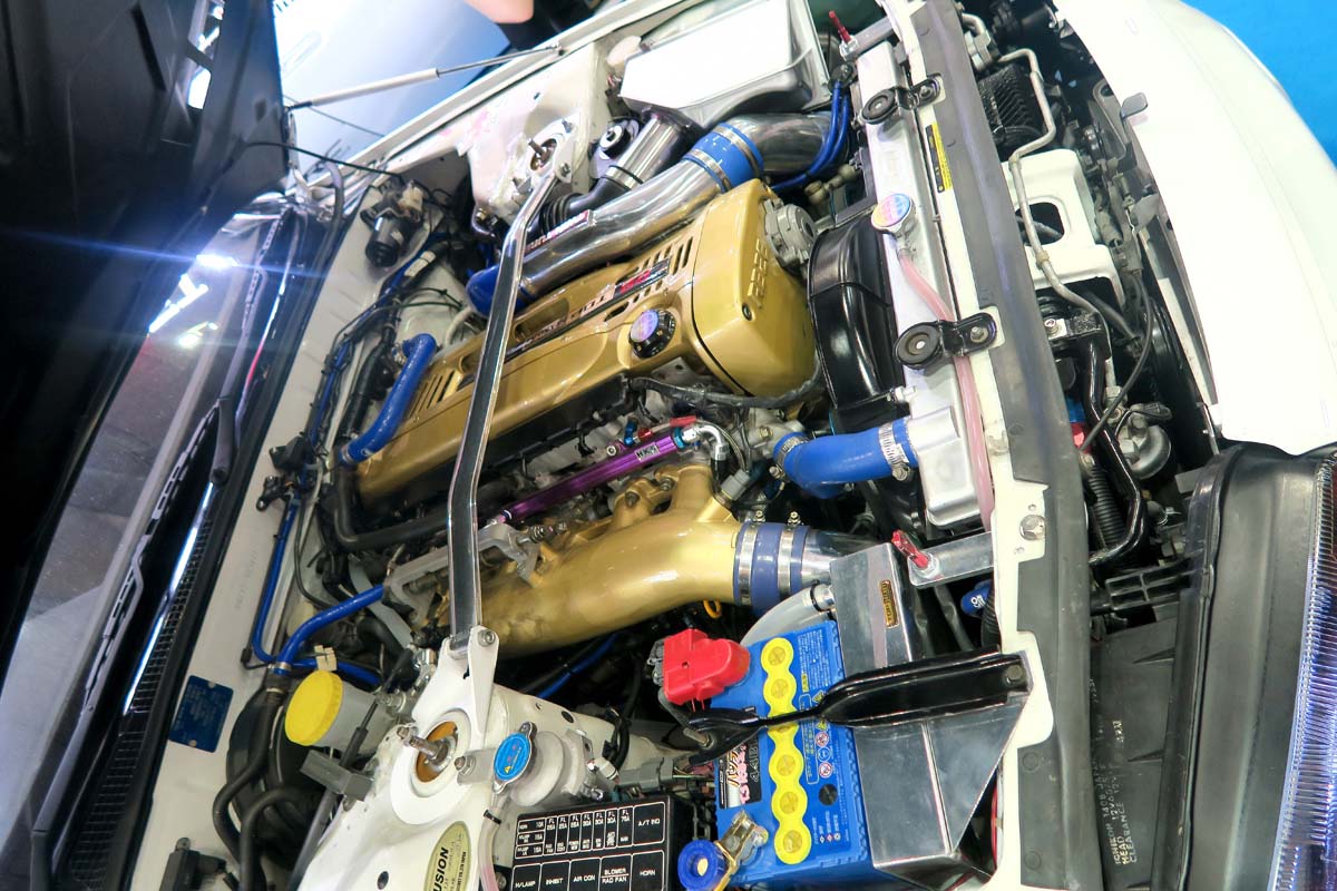 這輛白色R32基本上維持原廠外觀,透過Top Secret碳纖維下巴及白色塗裝的碳纖維引擎蓋加裝施以點綴,車體基本架構依舊維持26年前的感覺,引擎本體部分採用HKS 2.8kit施以強化,並且換上Nismo N1機油泵浦來改善RB引擎油壓泵浦不足的問題,渦輪機也以兩顆經過修改的T517Z取代原廠,雖然最大出力並沒有公佈,不過以這樣的設定來看保守估計應有550ps左右,變速箱部分採用R34的6速變速箱,並且將內部齒輪全數更換上Trust強化品,搭配ORC離合器及前後Nismo LSD。