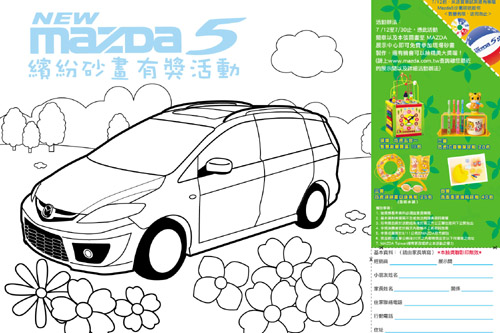 Taiwan Mazda為了增添親子間情感的連繫,讓親子關係更加溫,特別於即日起至30日舉辦「全新Mazda5繽紛砂畫展示間活動」,只要至MAZDA各展示中心,即可免費參加現場砂畫製作,還有機會抽精美大獎。另外,只要在7月30日前,前往全省展示中心賞車及試乘的消費者,就有機會獲得精美限量的專屬Mazda5沙灘球。
