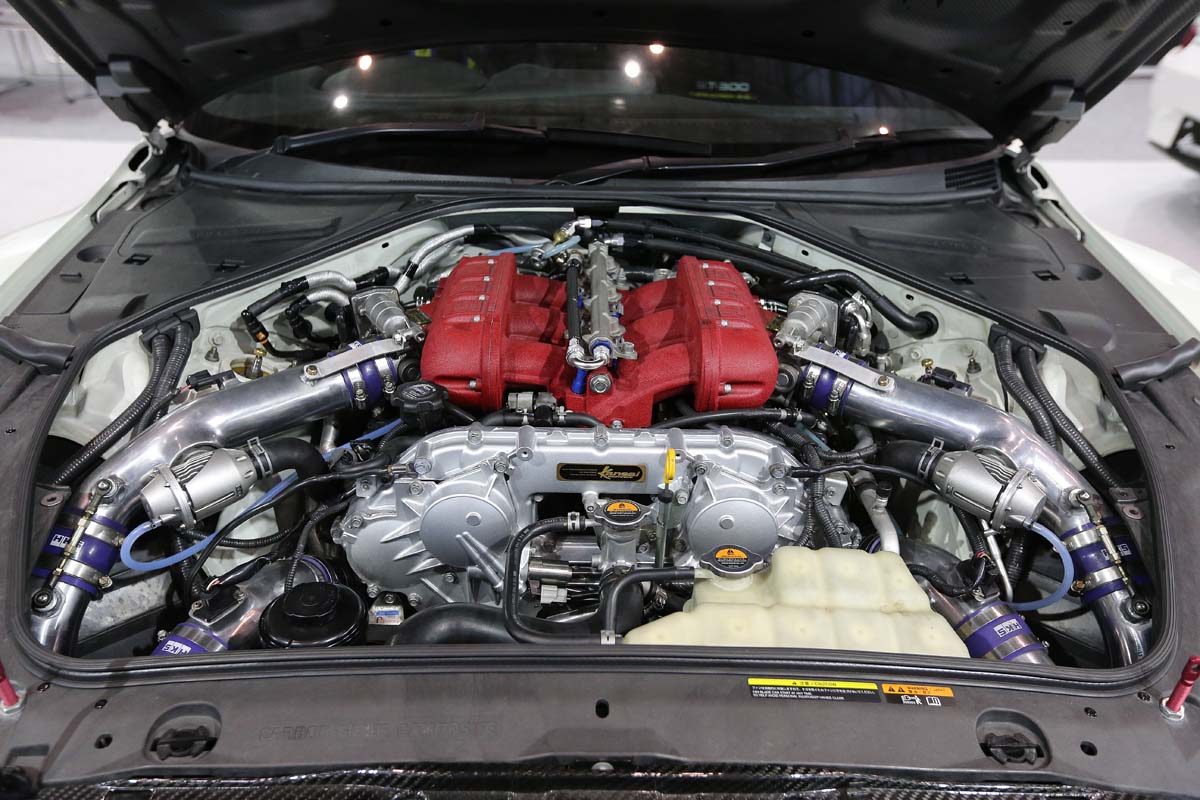 R35發表以來,從原廠引擎提高增壓值開始,這輛Kansai GT1000 GT-R則是直接攻頂採用GT1000的終極式樣,並且經過賽道的驗證,耐久度受到極大的肯定。想要超過1000ps以上的最大出力,VR38DETT在怎麼強悍也都需要徹底強化才行,HKS 4.1 kit鍛造活塞、連桿及曲軸將排氣量提升到4.1升,搭配上高角度凸輪軸及GT1000專用兩具GT II 7867渦輪機施以2.0bar的增壓值下,目前這輛車的最大動力已達1000ps/7300rpm,並且扭力更是高達120kgm/4400rpm,針對扭力部分變速箱本體已全數施以強化,更換上HKS GR6強化機油泵浦保持變速箱內部油壓安定,而為了消除轉向不足的問題,也在前後差速器內使用了Kansai所開發的機械式LSD。