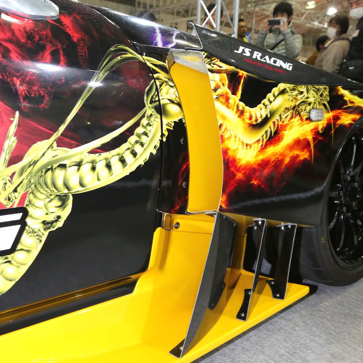 | 前葉子板誇張的寬體化,及下方側裙上類似「鰓」的導氣片設定,搭配上惡龍的全車彩繪,彷彿可以聽到魔王S2000-GT2喘氣的聲音。 |