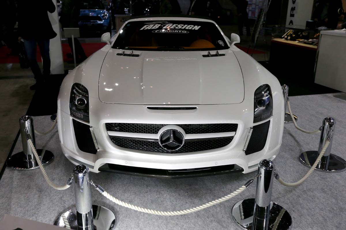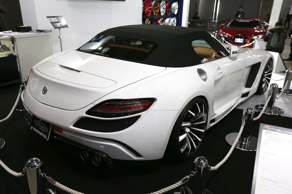 原廠SLS Roadster所擁有的流暢跑車化外型,雖然沒有Coupe上掀式車門來的搶眼,但是敞篷無限美好的上空風情還是相當受到歡迎,為了讓外觀能夠有更大幅度的變化以吸引眾人目光,為此由FAB Design所開發的空力外觀徹底改變其造型,為了強調獨一無二的運動特性從前保桿開始的造型就做了相當明顯的變化,除了因應寬體所需而向兩側延伸,兩側垂直的進氣壩附LED日行燈恰好與大燈造型連貫,而前下擾流猶如利刃輔以兩側的煞車散熱孔讓車頭空力效能完全獲得提升。不過為了引擎的進氣效能,可以看到前保桿上緣所增加的進氣孔能夠直接將冷空氣導入集氣箱,車側方面,採用寬體打造的前後葉子板包含側裙都增加大面積氣流孔,配合後保桿營造出結實的強健身形,堪稱是肌肉猛男,至於輪框則是換上Forgiato Navaja-ECX 20吋鍛造品。