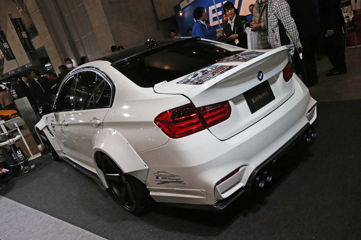 雖然LB Works所開發的寬體只僅限於雙門車型,但是逐漸受到改裝市場喜愛的傳統日式爆龜風格,反而開始有改裝品牌著手進行套件開發,而位在橫濱的MJK Customs透過原本外觀鈑件修復技術的優勢進而開發出專門針對BMW四門車款的寬體套件,透過東京改裝車展小試身手企圖爭取LB Works所未開發的四門市場。從外觀上可以看到前葉子板爆龜造型幾乎與LB Works相近,不過前保桿額外安裝的下擾流則明顯特別加強曲線,此外,引擎蓋除了採用M3式樣,同時還融入導風孔幫助熱氣排除。為了因應四門車型而開發的後輪葉子板,除了必須配合後門開啟角度,同時結合後保桿收尾的角度也更為凸出,加上後保桿與行李箱翹鴨尾都重新開發,企圖走出自己的設計風格,而因應整體外觀需求,另外還換裝Marvin避震器、多活塞卡鉗及20吋輪圈。