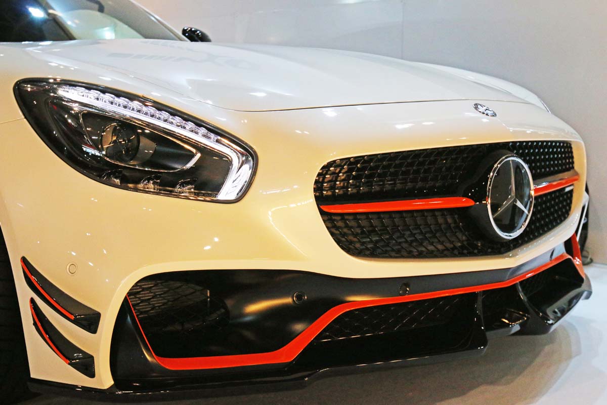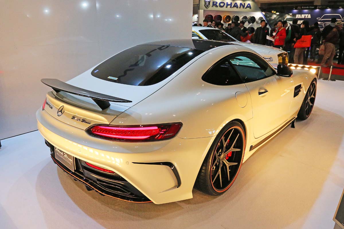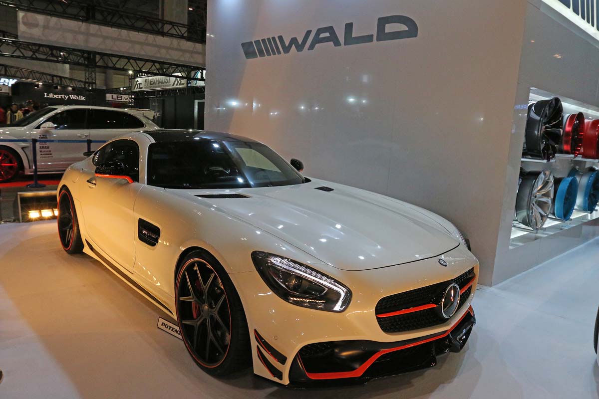 隨著車型不斷推陳出新,今年的東京改裝車展上經常能夠看到M.Benz AMG GT 的身影,而日本知名的VIP改裝品牌Wald更是推出「AMG Black Bison Edition」,從外觀上就能看見變化的差異性,首先可以看到紅色線條所勾勒出的車頭,明顯發現原廠保桿已經被Wald大幅改裝,下半部融合的前下擾流,另外在保桿兩側增加定風翼有助於提升下壓力,車側方面則是換裝側裙來改變側面線條,車尾除了在電動尾翼上增加尾翼之外,Wald將整支後保桿更換,在兩側加入導流孔與下分流器設計,配上21吋Wald鋁圈,整輛AMG GT就此性格大變。