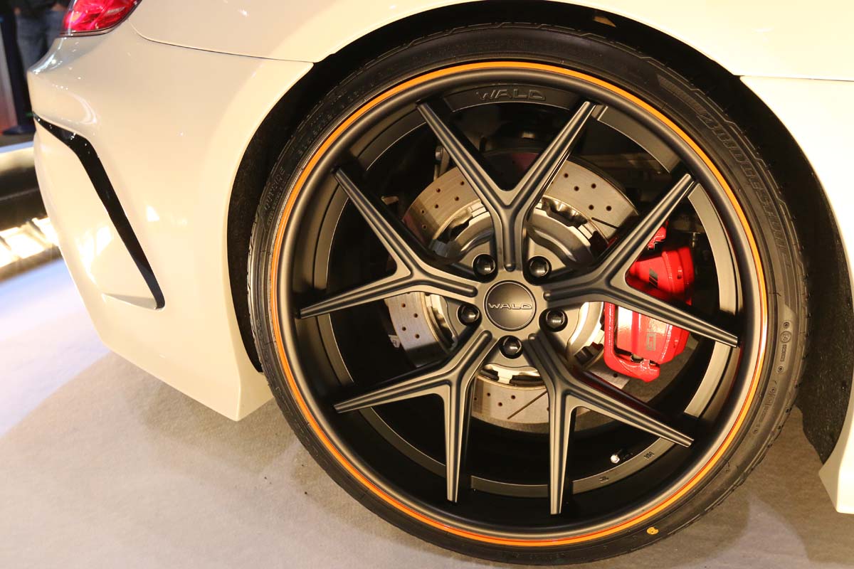 | 21吋輪圈升級除了搭配消光黑與外圈橘色稍加點綴,前255/30後295/25寬胎則提供抓地力。 |