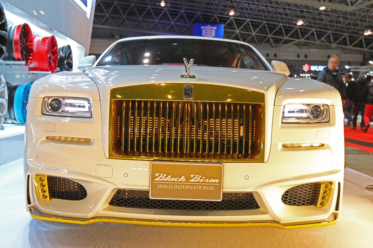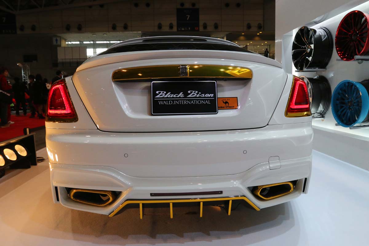除了性能十足的AMG GT展示,向來就是頂級豪華房車為宣傳主力的Wald,今年再度Rolls-Royce豪華雙門Wraith重新打造超貴氣的外觀,首先,WALD為原本看似方正的車頭換上運動化的前保險桿、側裙與後保險桿以及客製化的LED日行燈,不過單純只有運動化好像不是Wald應該有的風格,為此藉由鍍鉻金將水箱護罩、前後擾流板與車身飾板裝扮點綴出貴氣姿態,最後再加上Forgiato Tessi-M24吋鍛造輪圈輔以鍍鉻金當作爪面配色,金光閃閃的尊榮風範應該是人見人愛。