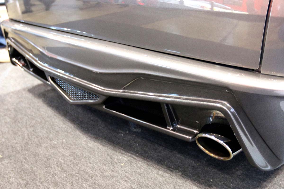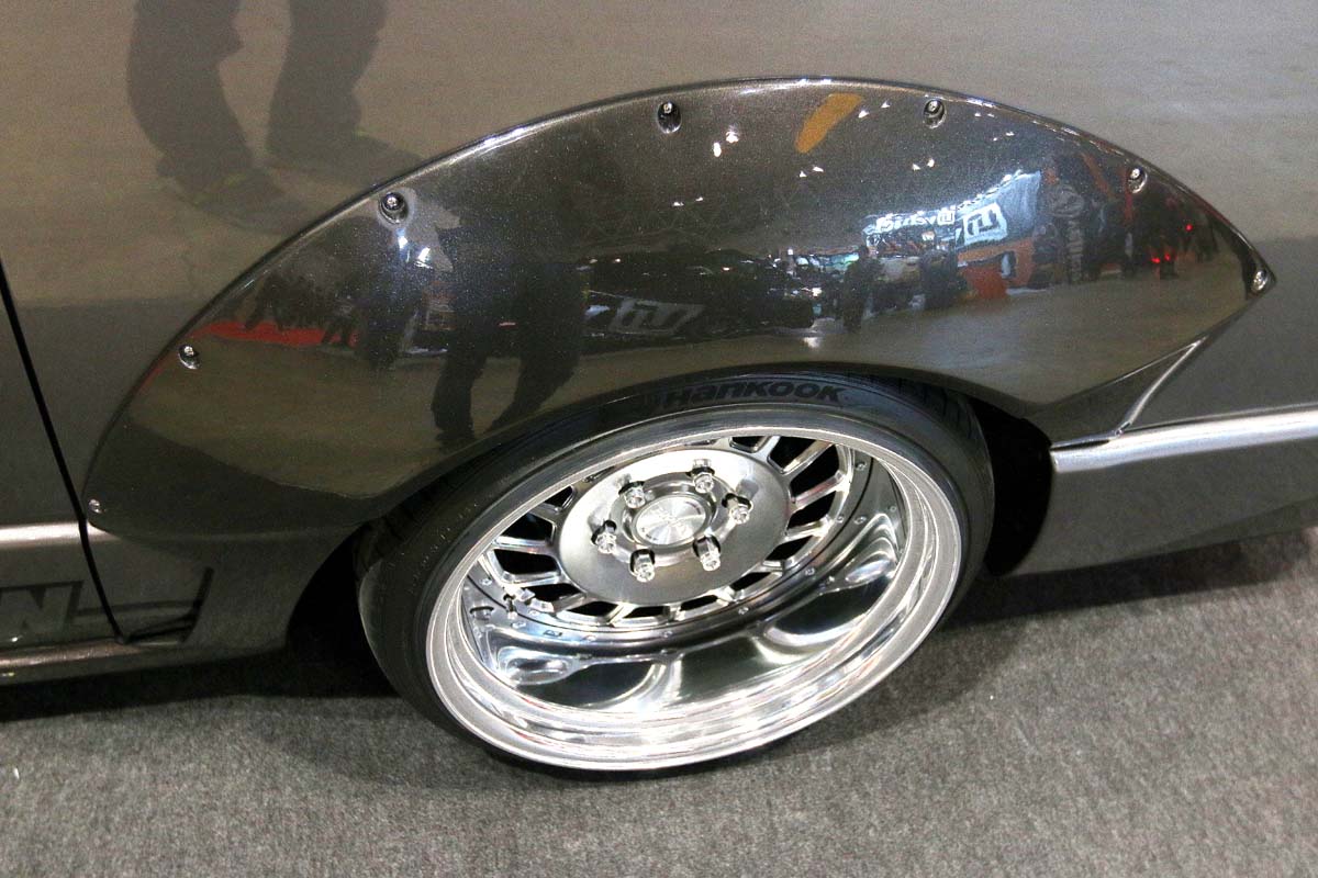 最近四年相當火紅的傳統日式寬體改裝,透過千萬超跑或者各式雙門跑車成功炒熱這股改裝風氣,不過據筆者了解LB Work只針對雙門跑車推出專屬爆龜套件,並沒有額外推出四門或商用貨卡套件才對啊!原來這是CRS所打造的Demo Car,四輪輪拱重新切割鈑件在鎖上象徵日式風格的粗曠寬體,另外藉由特殊訂製ET值得胎圈來營造不同的改裝氣息,但是既然要走寬體改裝風格怎麼能夠缺少氣壓避震器的相助呢,因此可以看見離地只剩10cm的距離,加上性能化的大包裝飾,就算不是千萬超跑也夠搶眼了。